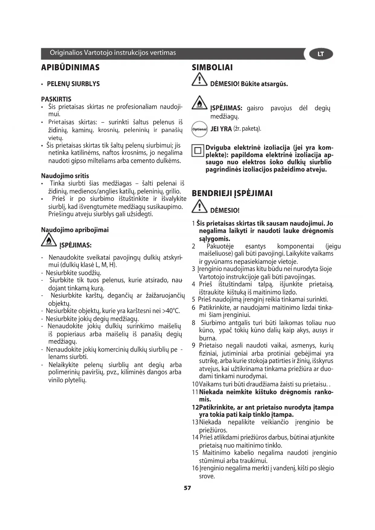 lenams siurbti. - Nelaikykite pelenų siurblių ant degių arba polimerinių paviršių, pvz., kiliminės dangos arba vinilo plytelių. SIMBOLIAI DĖMESIO! Būkite atsargūs. ĮSPĖJIMAS: gaisro pavojus dėl degių medžiagų. JEI YRA (žr. paketą). Dviguba elektrinė izoliacija (jei yra kom- plekte): papildoma elektrinė izoliacija ap- saugo nuo elektros šoko dulkių siurblio pagrindinės izoliacijos pažeidimo atveju.