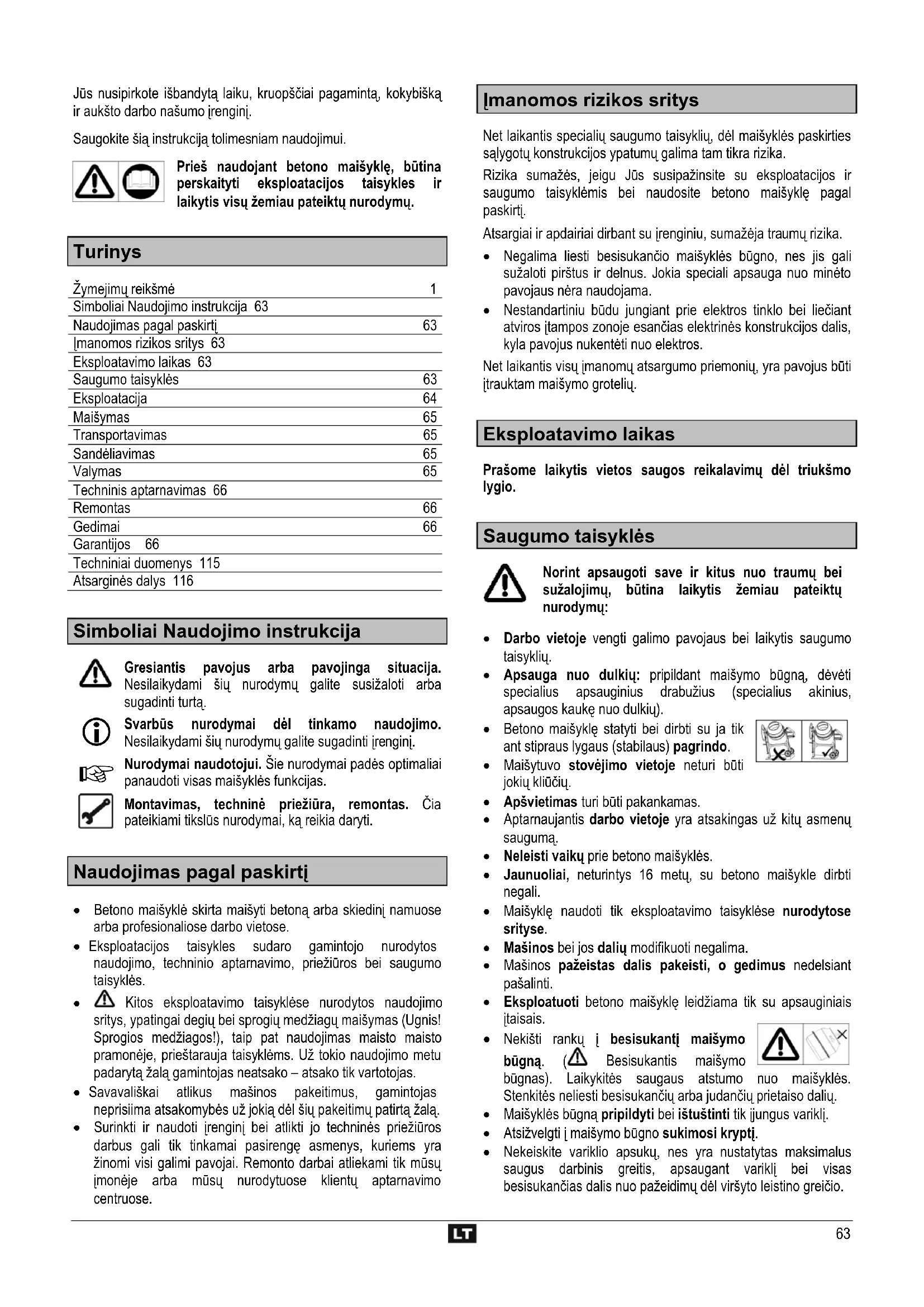 Turinys Žymejimų reikšmė 1 Simboliai Naudojimo instrukcija 63 Naudojimas pagal paskirtį 63 Įmanomos rizikos sritys 63 Eksploatavimo laikas 63 Saugumo taisyklės 63 Eksploatacija 64 Maišymas 65 Transportavimas 65 Sandėliavimas 65 Valymas 65 Techninis aptarnavimas 66 Remontas 66 Gedimai 66 Garantijos 66 Techniniai duomenys 115 Atsarginės dalys 116