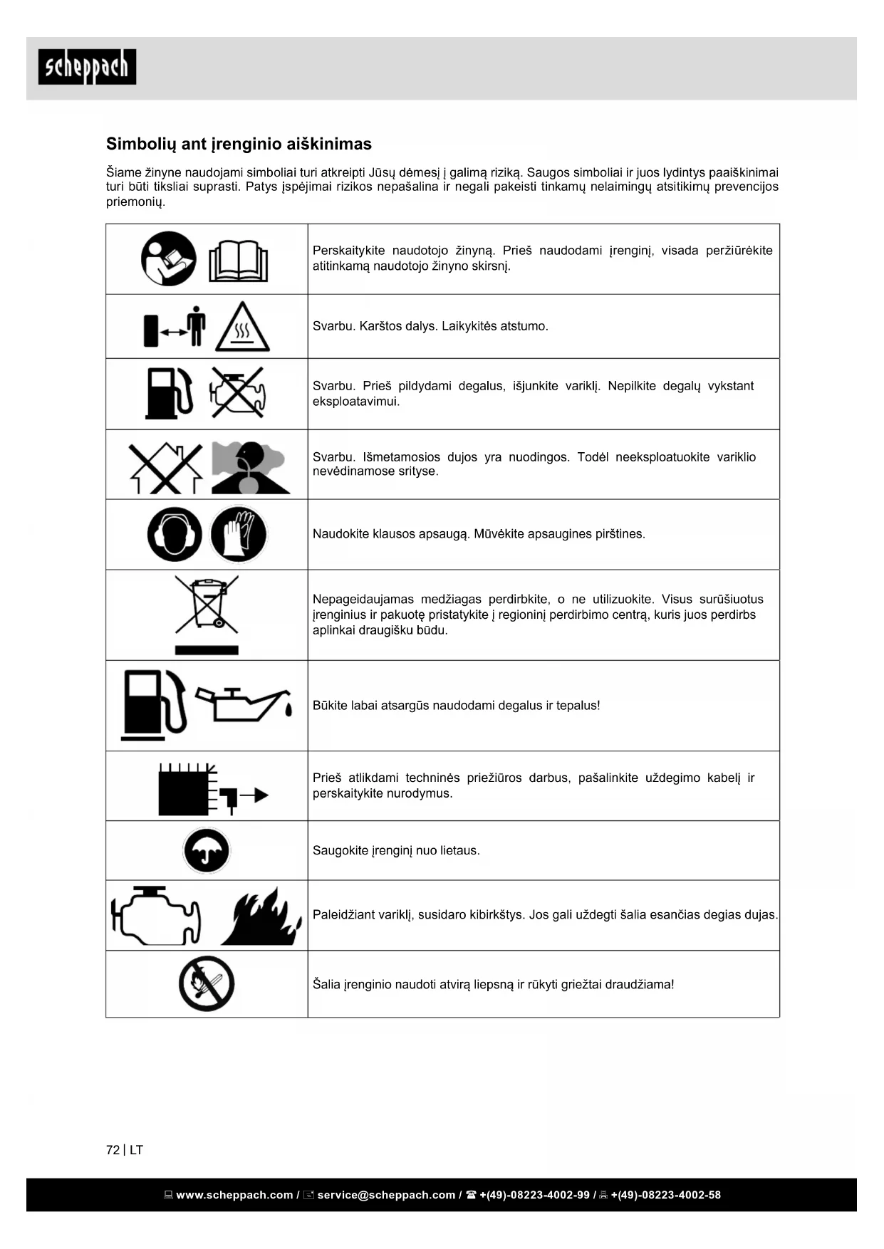 Simbolių ant įrenginio aiškinimas Šiame žinyne naudojami simboliai turi atkreipti Jūsų dėmesį į galimą riziką. Saugos simboliai ir juos lydintys paaiškinimai turi būti tiksliai suprasti. Patys įspėjimai rizikos nepašalina ir negali pakeisti tinkamų nelaimingų atsitikimų prevencijos priemonių. Perskaitykite naudotojo žinyną. Prieš naudodami įrenginį, visada peržiūrėkite atitinkamą naudotojo žinyno skirsnį. Svarbu. Karštos dalys. Laikykitės atstumo. Svarbu. Prieš pildydami degalus, išjunkite variklį. Nepilkite degalų vykstant eksploatavimui. Svarbu. Išmetamosios dujos yra nuodingos. Todėl neeksploatuokite variklio nevėdinamose srityse. Naudokite klausos apsaugą. Mūvėkite apsaugines pirštines. Nepageidaujamas medžiagas perdirbkite, o ne utilizuokite. Visus surūšiuotus įrenginius ir pakuotę pristatykite į regioninį perdirbimo centrą, kuris juos perdirbs aplinkai draugišku būdu. Būkite labai atsargūs naudodami degalus ir tepalus! Prieš atlikdami techninės priežiūros darbus, pašalinkite uždegimo kabelį ir perskaitykite nurodymus. Saugokite įrenginį nuo lietaus. Paleidžiant variklį, susidaro kibirkštys. Jos gali uždegti šalia esančias degias dujas. Šalia įrenginio naudoti atvirą liepsną ir rūkyti griežtai draudžiama! www.scheppach.com / service@scheppach.com / +(49)-08223-4002-99 / +(49)-08223-4002-58