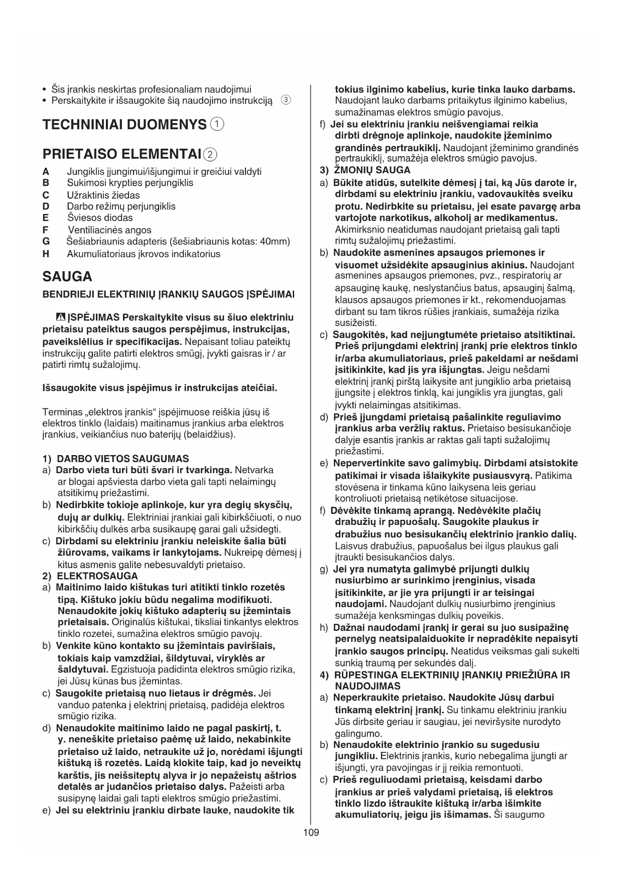 a) Akumuliatoriaus krovimui naudoti tik tuos įkroviklius, kuriuos rekomenduoja gamintojas. Naudojant kitokio tipo akumuliatoriams skirtą įkroviklį, kyla gaisro pavojus. b) Su prietaisu galima naudoti tik jam skirtą akumuliatorių. Naudojant kitokius akumuliatorius atsiranda pavojus susižeisti bei sukelti gaisrą. c) Nelaikykite sąvaržėlių, monetų, raktų, vinių, varžtų ar kitokių metalinių daiktų arti ištraukto iš instrumento akumuliatoriaus kontaktų. Užtrumpinus akumuliatoriaus kontaktus galima nusideginti ar sukelti gaisrą. d) Netinkamai naudojant akumuliatorių, iš jo gali ištekėti skystis. Venkite kontakto su šiuo skysčiu. Jei skystis pateko ant odos, nuplaukite jį vandeniu, jei pateko į akis - nedelsiant kreipkitės į gydytoją. Akumuliatoriaus skystis gali sukelti odos sudirginimą ar nudegimus. e) Nenaudokite pažeisto arba perdaryto akumuliatoriaus arba įrankio. Sugadinti arba perdaryti akumuliatoriai gali veikti nenuspėjamai – sukelti gaisrą, sprogimą arba traumų pavojų. f) Saugokite akumuliatorių arba įrankį nuo ugnies ir aukštos temperatūros. Patekęs į ugnį arba aukštesnę nei 130°C temperatūrą, jis gali sprogti. g) Vykdykite visas įkrovimo instrukcijas ir nekraukite akumuliatoriaus arba įrankio temperatūroje, neatitinkančioje instrukcijose nurodyto temperatūros diapazono ribų. Netinkamai kraunant arba jeigu temperatūra neatitinka nurodyto diapazono ribų, gali sugesti akumuliatorius ir kilti gaisras.