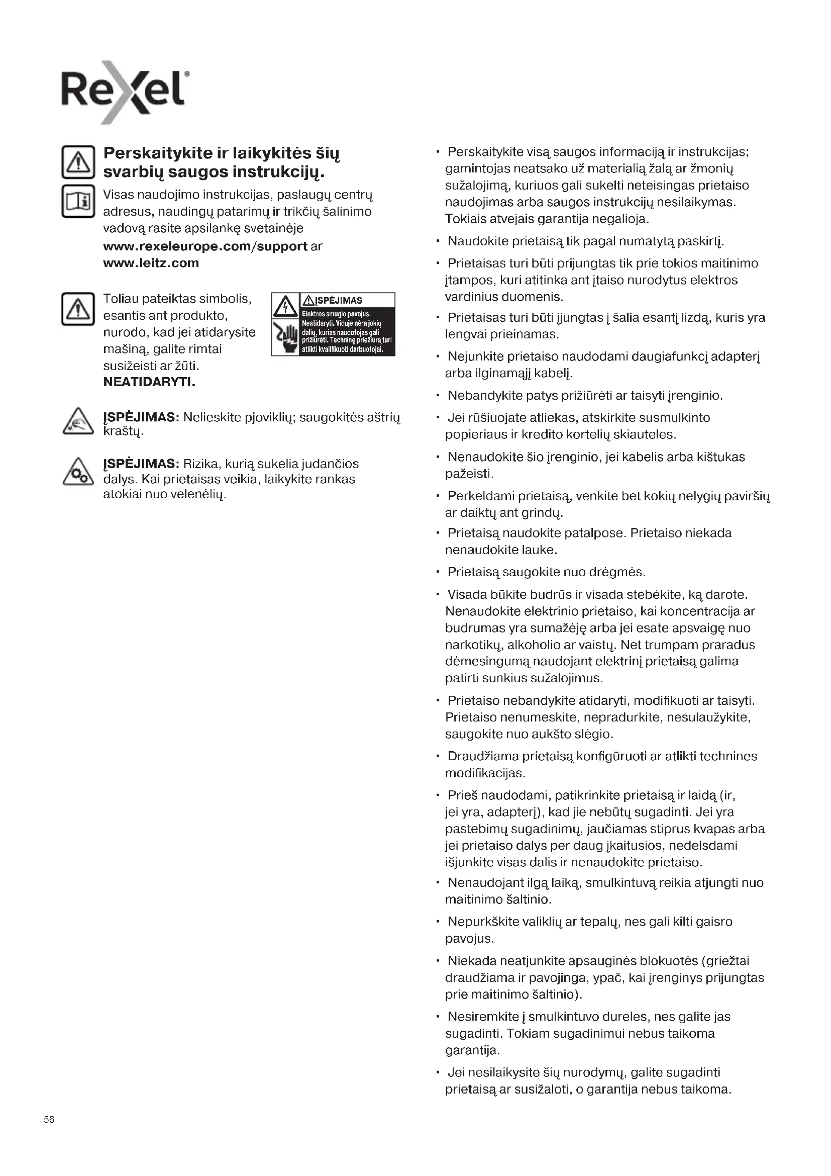 - Jei nesilaikysite šių nurodymų, galite sugadinti prietaisą ar susižaloti, o garantija nebus taikoma. Perskaitykite ir laikykitės šių svarbių saugos instrukcijų. Visas naudojimo instrukcijas, paslaugų centrų adresus, naudingų patarimų ir trikčių šalinimo vadovą rasite apsilankę svetainėje www.rexeleurope.com/support ar www.leitz.com ĮSPĖJIMAS: Nelieskite pjoviklių; saugokitės aštrių kraštų. ĮSPĖJIMAS: Rizika, kurią sukelia judančios dalys. Kai prietaisas veikia, laikykite rankas atokiai nuo velenėlių.57 Laikykite papuošalus atokiau Laikykite kaklaraiščius ir laisvus drabužius atokiau Įspėjamieji simboliai Laikykite ilgus plaukus atokiau Nekiškite rankų į paėmimo angą Įspėjamieji simboliai Lapų kiekis Nedėkite kompaktinių plokštelių Nedėkite kietų sąsagėlių, didesnių nei 26 mm Įspėjimas: judančios dalys Šis prietaisas nėra skirtas naudoti vaikams Nenaudokite aerozolių. Nepurkškite valiklių ar tepalų, nes gali kilti gaisro pavojus. Pikto gramą Type Slankusis jungiklis / indikatorius ir veiksmas Valdymo mygtukai Automatinio paleidimo ir budėjimo mygtukas (spausti vienu metu) Rankinis atvirkštinės eigos mygtukas (laikyti nuspaudus) Rankinis priekinės eigos mygtukas (laikyti nuspaudus) Perkaitimo indikatorius (leiskite smulkintuvui atvėsti) Perkrovos indikatorius / Užstrigimo indikatorius (sumažinkite lapų skaičių / pašalinkite užstrigimą) Modeliai su pastūmimo mygtuku Pikto gramą Type Slankusis jungiklis / indikatorius ir veiksmas Slankusis jungiklis Automatinis paleidimas (pastumkite ties smulkinimo padėtimi) Atbulinė eiga (pastumkite į padėtį) Priekinė eiga (pastumkite į padėtį) Būsenos indikatoriai Išjungimas (pastumkite į padėtį) Parengties indikatorius (įsitikinkite, kad smulkintuvo galvutė yra ant atliekų konteinerio, o slankusis jungiklis yra automatinio paleidimo padėtyje) Perkaitimo indikatorius (leiskite smulkintuvui atvėsti) Valdikliai ir indikatoriai Modeliai su slankiuoju jungikliu Nedėkite kredito kortelių Priedai Naudokite tik „Rexel“ priedus: Alyvos lapai (20) - 2101949 Alyvos lapai (12) - 210194858 Storą popierių arba korteles <200 g/m². Kelis sulankstytus lapus (A3 lapus, sulankstytus per pusę). Blizgų popierių arba lapus, padengtus spaudmenimis abiejose pusėse. CD ir DVD. Nenaudokite aerozolių Nėra aliejaus, tik aliejaus lakštai Smulkintuvo pajėgumas GALITE susmulkinti: