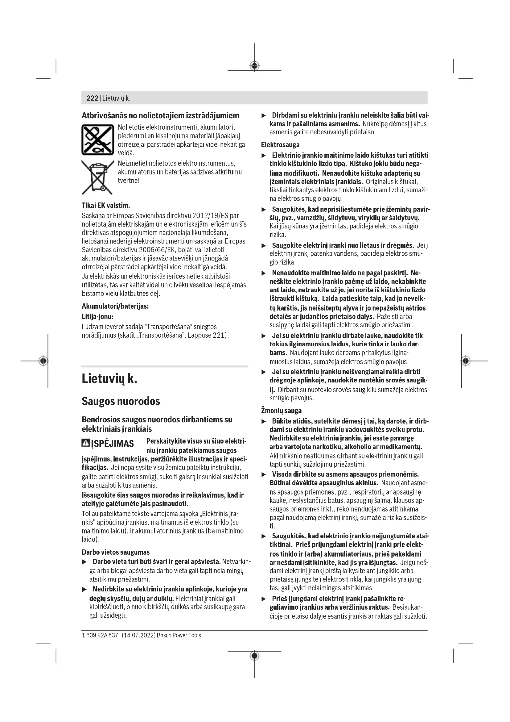 Low Energy Module GCY 30-4 (papildpiederums) tiek izmantots radio interfeiss. Tāpēc jāievēro vietējie lietošanas ierobežojumi, kādi pastāv, piemēram, lidmašīnās un slimnīcās. u Kontaktējiet darbinstrumentu ar uzgriezni vai skrūvi tikai laikā, kad elektroinstruments ir izslēgts. Rotējošs darbinstruments var noslīdēt no skrūves galvas. Lai izņemtu skrūvgrieža uzgali vai universālo turētāju, drīkst lietot palīgrīkus. Turētājs stiprināšanai pie jostas Izmantojot turētāju (10), elektroinstrumentu var piekarināt, piemēram, pie jostas. Tas ļauj izbrīvēt darbam abas rokas, un elektroinstruments vienmēr ir viegli sasniedzams. Apkalpošana un apkope Apkalpošana un tīrīšana u Veicot jebkurus darbus ar elektroinstrumentu (piemēram, apkalpošanu, darbinstrumentu nomaiņu utt.), kā arī pirms tā transportēšanas vai uzglabāšanas vienmēr izņemiet no elektroinstrumenta akumulatoru. Ieslēdzēja nejauša nospiešana var izraisīt savainojumu. u Lai elektroinstruments darbotos droši un bez atteikumiem, regulāri tīriet tā korpusu un ventilācijas atveres. Klientu apkalpošanas dienests un konsultācijas par lietošanu Klientu apkalpošanas dienests atbildēs uz Jūsu jautājumiem par izstrādājumu remontu un apkalpošanu, kā arī par to rezerves daļām. Kopsalikuma attēlus un informāciju par rezerves daļām Jūs varat atrast interneta vietnē: www.bosch-pt.com Bosch konsultantu grupa palīdzēs Jums vislabākajā veidā rast atbildes uz jautājumiem par mūsu izstrādājumiem un to piederumiem. Pieprasot konsultācijas un pasūtot rezerves daļas, noteikti paziņojiet 10zīmju izstrādājuma numuru, kas norādīts uz izstrādājuma marķējuma plāksnītes. Latvijas Republika Robert Bosch SIA Bosch elektroinstrumentu servisa centrs Mūkusalas ielā 97 LV-1004 Rīga Tālr.: 67146262 Telefakss: 67146263 E-pasts: service-pt@lv.bosch.com Papildu klientu apkalpošanas dienesta adreses skatiet šeit: www.bosch-pt.com/serviceaddresses Transportēšana Ieteicamajiem litija jonu akumulatoriem ir piemērojami Bīstamo kravu aprites likuma noteikumi. Lietotājs var transportēt akumulatorus ielu transporta plūsmā bez papildu nosacījumiem. Pārsūtot tos ar trešo personu starpniecību (piemēram, ar gaisa transporta vai citu transporta aģentūru starpniecību), jāievēro īpaši sūtījuma iesaiņošanas un marķēšanas noteikumi. Tāpēc sūtījumu sagatavošanas laikā jāpieaicina bīstamo kravu pārvadāšanas speciālists. Pārsūtiet akumulatoru tikai tad, ja tā korpuss nav bojāts. Aizlīmējiet vaļējos akumulatora kontaktus un iesaiņojiet akumulatoru tā, lai tas iesaiņojumā nepārvietotos. Lūdzam ievērot arī ar akumulatoru pārsūtīšanu saistītos nacionālos noteikumus, ja tādi pastāv. Bosch Power Tools 1 609 92A 837 | (14.07.2022)222 | Lietuvių k. Atbrīvošanās no nolietotajiem izstrādājumiem Nolietotie elektroinstrumenti, akumulatori, piederumi un iesaiņojuma materiāli jāpakļauj otrreizējai pārstrādei apkārtējai videi nekaitīgā veidā. Neizmetiet nolietotos elektroinstrumentus, akumulatorus un baterijas sadzīves atkritumu tvertnē! Tikai EK valstīm. Saskaņā ar Eiropas Savienības direktīvu 2012/19/ES par nolietotajām elektriskajām un elektroniskajām ierīcēm un šīs direktīvas atspoguļojumiem nacionālajā likumdošanā, lietošanai nederīgi elektroinstrumenti un saskaņā ar Eiropas Savienības direktīvu 2006/66/EK, bojāti vai izlietoti akumulatori/baterijas ir jāsavāc atsevišķi un jānogādā otrreizējai pārstrādei apkārtējai videi nekaitīgā veidā. Ja elektriskās un elektroniskās ierīces netiek atbilstoši utilizētas, tās var kaitēt videi un cilvēku veselībai iespējamās bīstamo vielu klātbūtnes dēļ. Akumulatori/baterijas: Litija-jonu: Lūdzam ievērot sadaļā "Transportēšana" sniegtos norādījumus (skatīt „Transportēšana“, Lappuse221). Lietuvių k. Saugos nuorodos Bendrosios saugos nuorodos dirbantiems su elektriniais įrankiais ĮSPĖJIMAS Perskaitykite visus su šiuo elektri- niu įrankiu pateikiamus saugos įspėjimus, instrukcijas, peržiūrėkite iliustracijas ir speci- fikacijas. Jei nepaisysite visų žemiau pateiktų instrukcijų, galite patirti elektros smūgį, sukelti gaisrą ir sunkiai susižaloti arba sužaloti kitus asmenis. Išsaugokite šias saugos nuorodas ir reikalavimus, kad ir ateityje galėtumėte jais pasinaudoti. Toliau pateiktame tekste vartojama sąvoka „Elektrinis įra- nkis“ apibūdina įrankius, maitinamus iš elektros tinklo (su maitinimo laidu), ir akumuliatorinius įrankius (be maitinimo laido). Darbo vietos saugumas u Darbo vieta turi būti švari ir gerai apšviesta. Netvarkin- ga arba blogai apšviesta darbo vieta gali tapti nelaimingų atsitikimų priežastimi. u Nedirbkite su elektriniu įrankiu aplinkoje, kurioje yra degių skysčių, dujų ar dulkių. Elektriniai įrankiai gali kibirkščiuoti, o nuo kibirkščių dulkės arba susikaupę garai gali užsidegti. u Dirbdami su elektriniu įrankiu neleiskite šalia būti vai- kams ir pašaliniams asmenims. Nukreipę dėmesį į kitus asmenis galite nebesuvaldyti prietaiso. Elektrosauga u Elektrinio įrankio maitinimo laido kištukas turi atitikti tinklo kištukinio lizdo tipą. Kištuko jokiu būdu nega- lima modifikuoti. Nenaudokite kištuko adapterių su įžemintais elektriniais įrankiais. Originalūs kištukai, tiksliai tinkantys elektros tinklo kištukiniam lizdui, sumaži- na elektros smūgio pavojų. u Saugokitės, kad neprisiliestumėte prie įžemintų pavir- šių, pvz., vamzdžių, šildytuvų, viryklių ar šaldytuvų. Kai jūsų kūnas yra įžemintas, padidėja elektros smūgio rizika. u Saugokite elektrinį įrankį nuo lietaus ir drėgmės. Jei į elektrinį įrankį patenka vandens, padidėja elektros smū- gio rizika. u Nenaudokite maitinimo laido ne pagal paskirtį. Ne- neškite elektrinio įrankio paėmę už laido, nekabinkite ant laido, netr