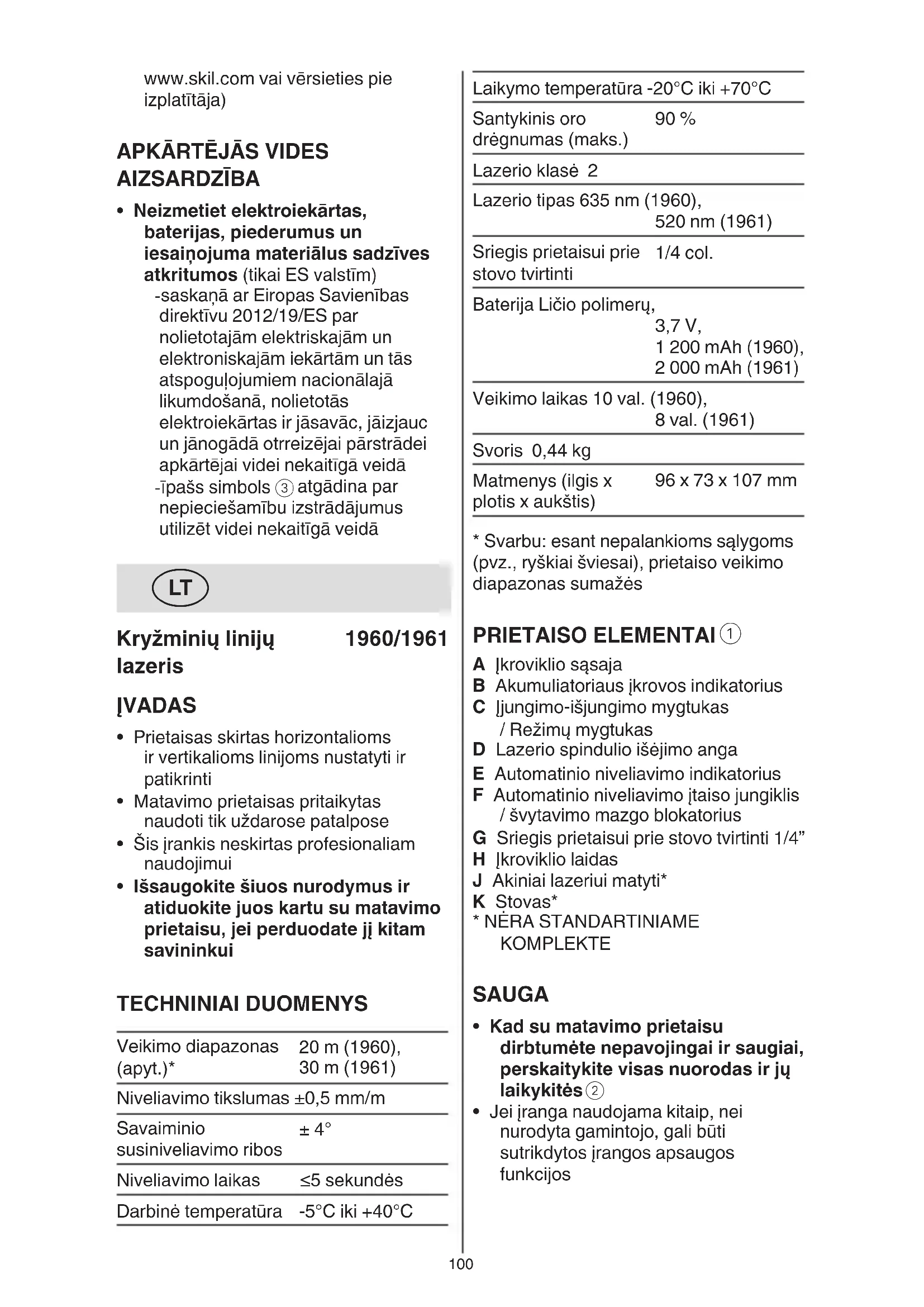 - Išsaugokite šiuos nurodymus ir atiduokite juos kartu su matavimo prietaisu, jei perduodate jį kitam savininkui TECHNINIAI DUOMENYS Veikimo diapazonas (apyt.)* 20 m (1960), 30 m (1961) Niveliavimo tikslumas ±0,5 mm/m Savaiminio susiniveliavimo ribos ± 4° Niveliavimo laikas ≤5 sekundės Darbinė temperatūra -5°C iki +40°C101 ! perskaitykite instrukciją, pateiktą su įkrovikliu arba maitinimo šaltiniu, ir jos laikykitės - naudokite tik įkroviklį arba maitinimo šaltinį, kurio išėjimo įtampa yra 5 V ir išėjimo srovė – ≥ 0,5 A - sujunkite įkroviklio kabelį H su įkrovikliu arba maitinimo šaltiniu (nėra standartiniame įrangos komplekte) ir su įkroviklio sąsaja A - indikatorius B mirksi RAUDONAI, t. y. rodo, kad akumuliatorius yra įkraunamas, o esamo akumuliatoriaus įkrovos lygio užtektų tam, kad prietaisas veiktų 30 minučių arba ilgiau - indikatorius B mirksi GELTONAI, t. y. rodo, kad akumuliatorius yra įkraunamas, o esamo akumuliatoriaus įkrovos lygio užtektų tam, kad prietaisas veiktų ilgiau nei 30 minučių - indikatorius B mirksi ŽALIAI, t. y. rodo, kad akumuliatorius įkrautas daugiau nei 90 % visos jo talpos - nuolat ŽALIAI degantis indikatorius B rodo, kad akumuliatorius yra visiškai įkrautas