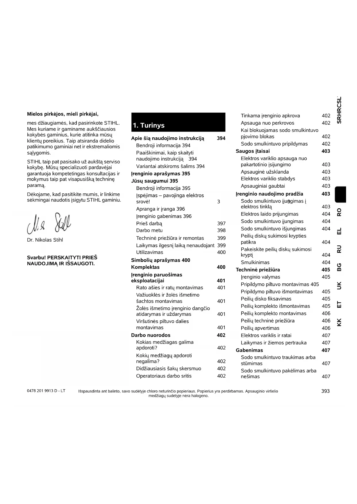 SRHRCSLVLT 0478 201 9913 D - LT ROELRUBGUKETKK Mielos pirkėjos, mieli pirkėjai, mes džiaugiamės, kad pasirinkote STIHL. Mes kuriame ir gaminame aukščiausios kokybės gaminius, kurie atitinka mūsų klientų poreikius. Taip atsiranda didelio patikimumo gaminiai net ir ekstremaliomis sąlygomis. STIHL taip pat pasisako už aukštą serviso kokybę. Mūsų specializuoti pardavėjai garantuoja kompetetingas konsultacijas ir mokymus taip pat visapusišką techninę paramą. Dėkojame, kad pasitikite mumis, ir linkime sėkmingai naudotis įsigytu STIHL gaminiu. Dr. Nikolas Stihl Svarbu! PERSKAITYTI PRIEŠ NAUDOJIMĄ IR IŠSAUGOTI. Išspausdinta ant balinto, savo sudėtyje chloro neturinčio popieriaus. Popierius yra perdirbamas. Apsauginio viršelio medžiagų sudėtyje nėra halogeno.