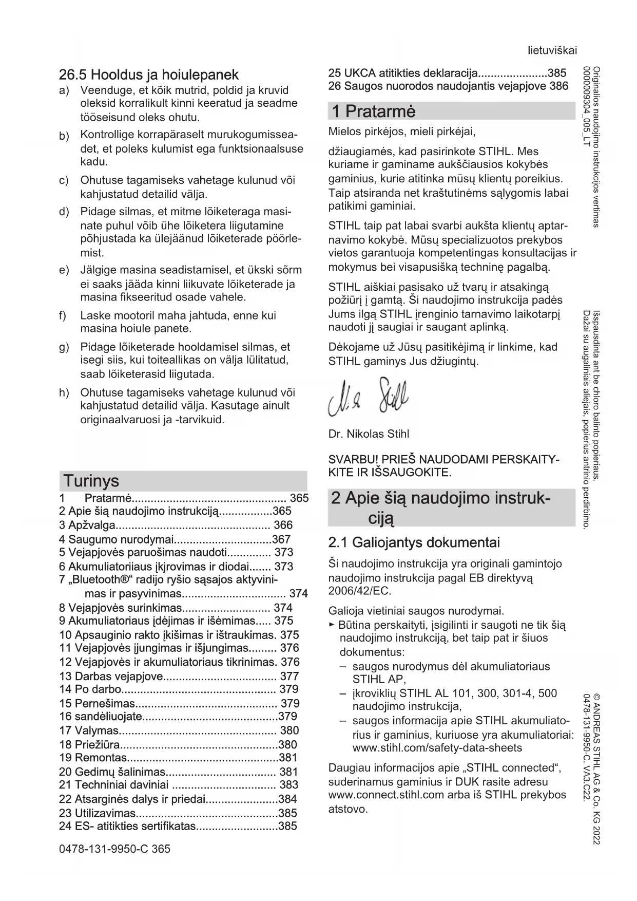 saugos informacija apie STIHL akumuliato‐ rius ir gaminius, kuriuose yra akumuliatoriai: www.stihl.com/safety-data-sheets Daugiau informacijos apie „STIHL connected“, suderinamus gaminius ir DUK rasite adresu www.connect.stihl.com arba iš STIHL prekybos atstovo. lietuviškai 0478-131-9950-C 365 © ANDREAS STIHL AG & Co. KG 2022 0478-131-9950-C. VA3.C22. Išspausdinta ant be chloro balinto popieriaus. Dažai su augaliniais aliejais, popierius antrinio perdirbimo. Originalios naudojimo instrukcijos vertimas 0000009304_005_LT„Bluetooth