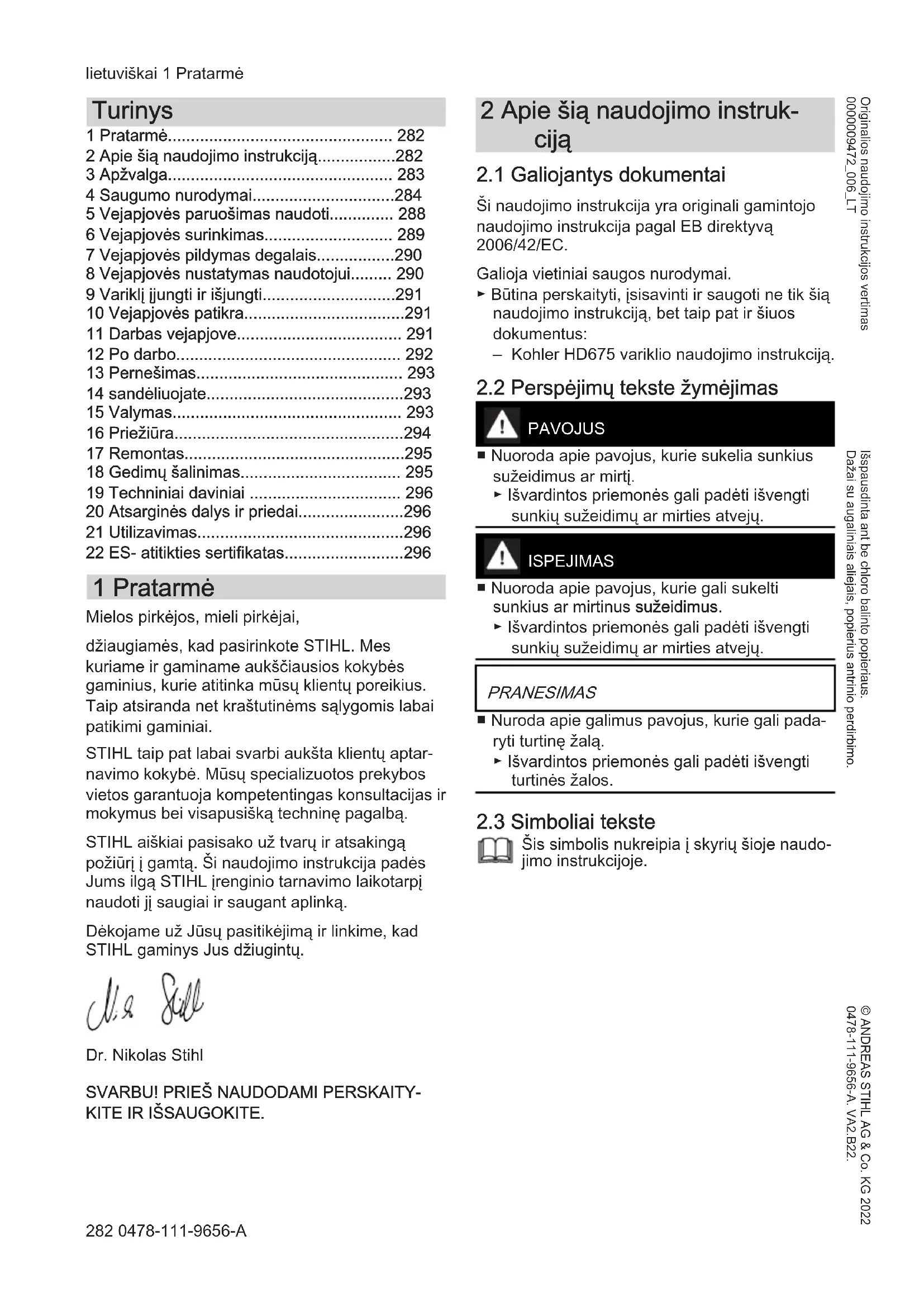 - 22 ES- atitikties sertifikatas 1 Pratarmė Mielos pirkėjos, mieli pirkėjai, džiaugiamės, kad pasirinkote STIHL. Mes kuriame ir gaminame aukščiausios kokybės gaminius, kurie atitinka mūsų klientų poreikius. Taip atsiranda net kraštutinėms sąlygomis labai patikimi gaminiai. STIHL taip pat labai svarbi aukšta klientų aptar‐ navimo kokybė. Mūsų specializuotos prekybos vietos garantuoja kompetentingas konsultacijas ir mokymus bei visapusišką techninę pagalbą. STIHL aiškiai pasisako už tvarų ir atsakingą požiūrį į gamtą. Ši naudojimo instrukcija padės Jums ilgą STIHL įrenginio tarnavimo laikotarpį naudoti jį saugiai ir saugant aplinką. Dėkojame už Jūsų pasitikėjimą ir linkime, kad STIHL gaminys Jus džiugintų. Dr. Nikolas Stihl p. 296