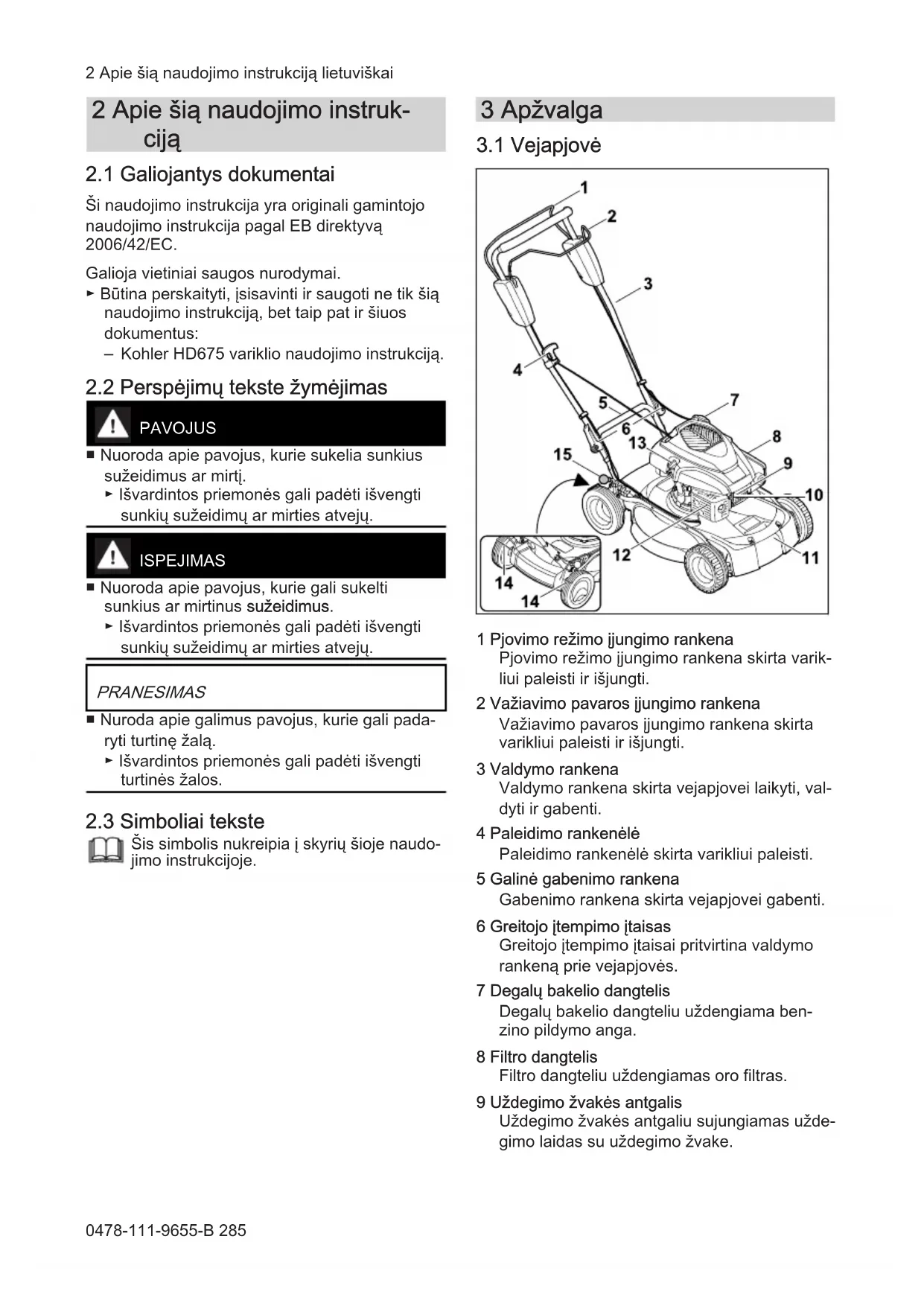 Naudotojo fiziniai, jutiminiai ir psichiniai gebėjimai pakankami, kad galėtų valdyti vejapjovę ir atlikti ja darbus. Jei naudo‐ tojo fiziniai, jutiminiai arba psichiniai gebėjimai riboti, naudotojas juo dirbti gali tik prižiūrimas ar instruktuojamas už jį atsakingo asmens. lietuviškai 4 Saugumo nurodymai 286 0478-111-9655-B– Naudotojas sugeba atpažinti ir įvertinti vejapjovės keliamą pavojų.