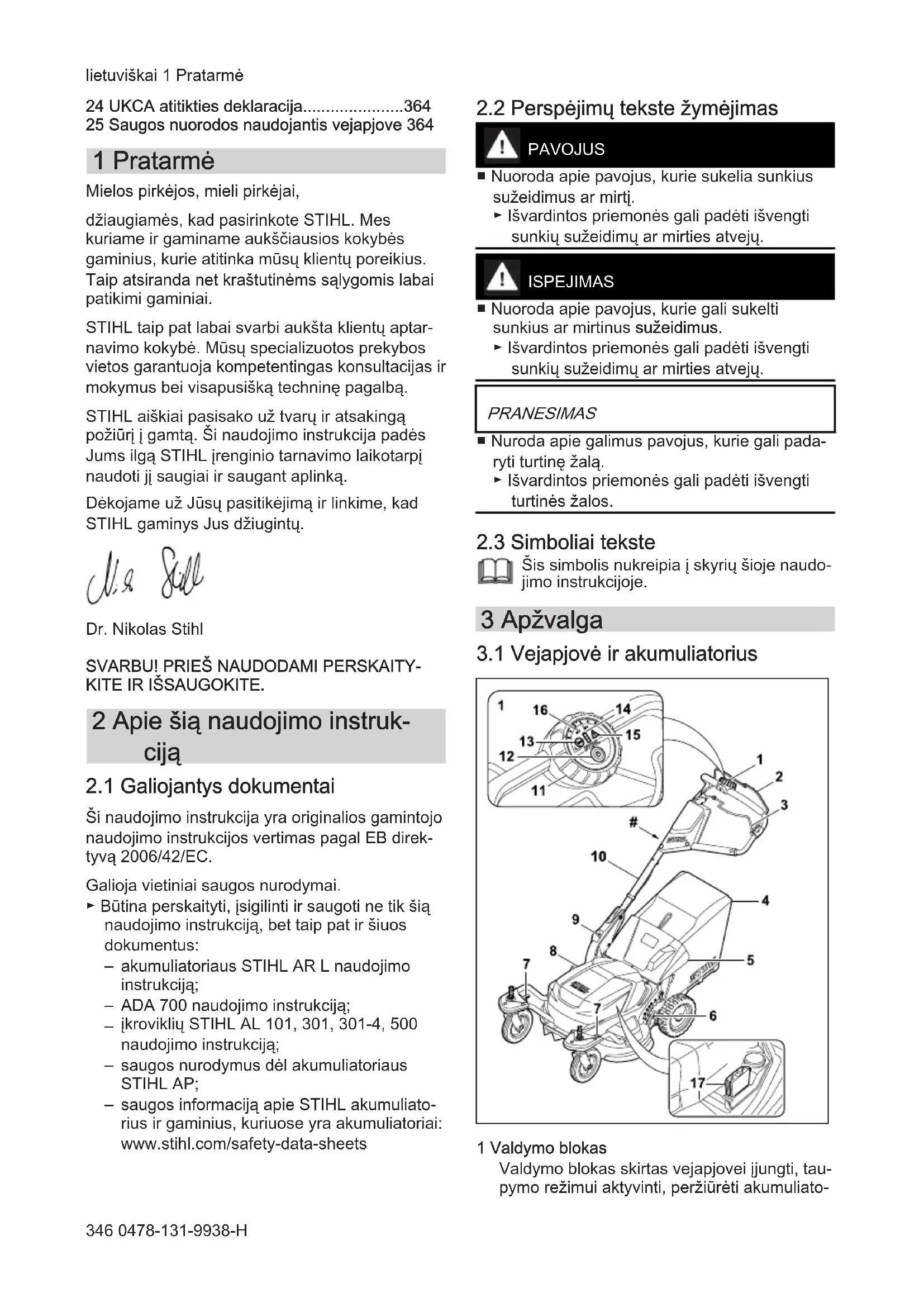 - lietuviškai 0478-131-9938-H 345 © ANDREAS STIHL AG & Co. KG 2023 0478-131-9938-H. VA0.G23. Išspausdinta ant be chloro balinto popieriaus. Popierių galima perdirbti. Originalios naudojimo instrukcijos vertimas 0000008816_015_LT24 UKCA atitikties deklaracija 25 Saugos nuorodos naudojantis vejapjove 364 1 Pratarmė Mielos pirkėjos, mieli pirkėjai, džiaugiamės, kad pasirinkote STIHL. Mes kuriame ir gaminame aukščiausios kokybės gaminius, kurie atitinka mūsų klientų poreikius. Taip atsiranda net kraštutinėms sąlygomis labai patikimi gaminiai. STIHL taip pat labai svarbi aukšta klientų aptar‐ navimo kokybė. Mūsų specializuotos prekybos vietos garantuoja kompetentingas konsultacijas ir mokymus bei visapusišką techninę pagalbą. STIHL aiškiai pasisako už tvarų ir atsakingą požiūrį į gamtą. Ši naudojimo instrukcija padės Jums ilgą STIHL įrenginio tarnavimo laikotarpį naudoti jį saugiai ir saugant aplinką. Dėkojame už Jūsų pasitikėjimą ir linkime, kad STIHL gaminys Jus džiugintų. Dr. Nikolas Stihl p. 364