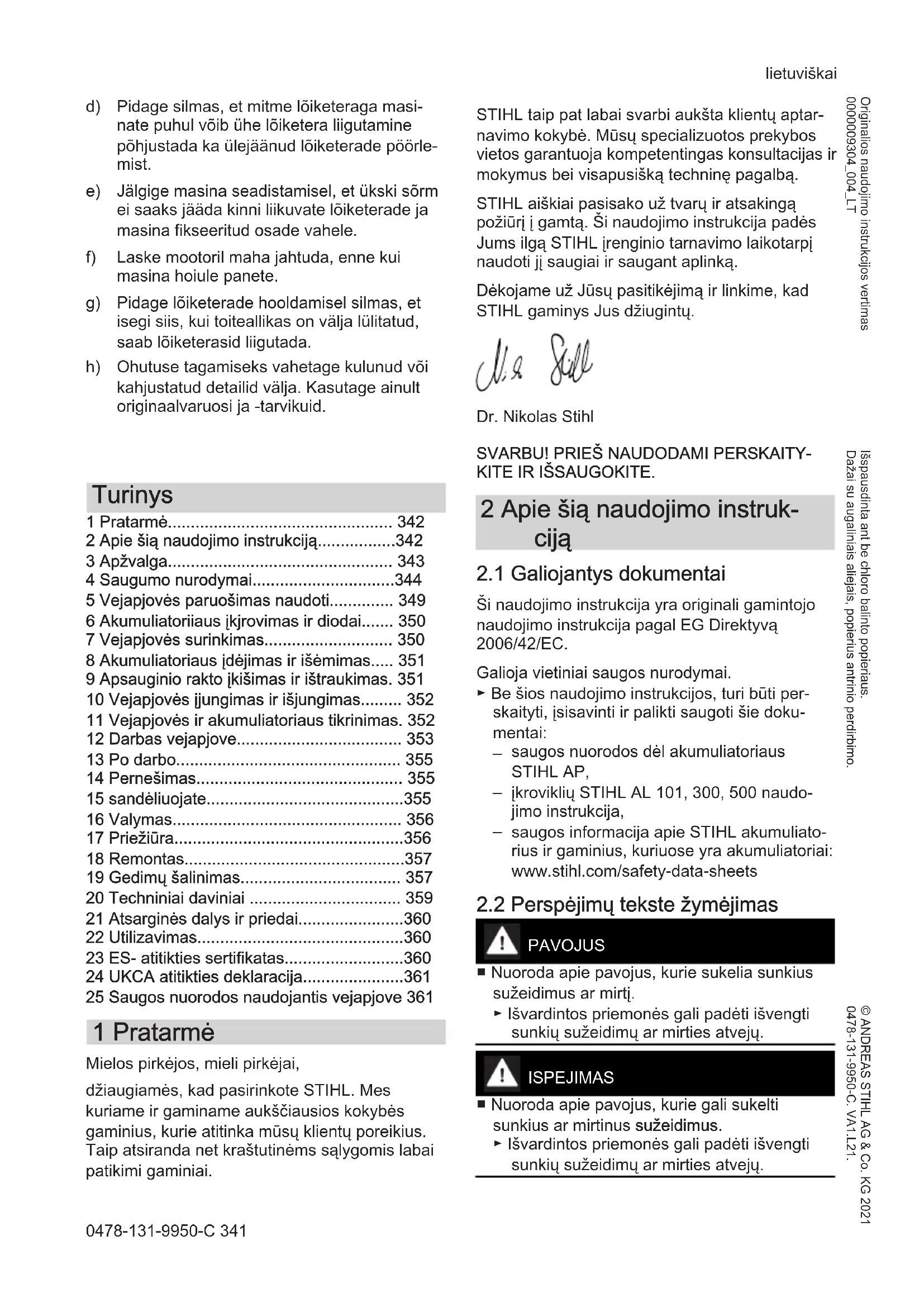 PAVOJUS ■ Nuoroda apie pavojus, kurie sukelia sunkius sužeidimus ar mirtį. ► Išvardintos priemonės gali padėti išvengti sunkių sužeidimų ar mirties atvejų. ISPEJIMAS ■ Nuoroda apie pavojus, kurie gali sukelti sunkius ar mirtinus sužeidimus. ► Išvardintos priemonės gali padėti išvengti sunkių sužeidimų ar mirties atvejų. lietuviškai 0478-131-9950-C 341 © ANDREAS STIHL AG & Co. KG 2021 0478-131-9950-C. VA1.L21. Išspausdinta ant be chloro balinto popieriaus. Dažai su augaliniais aliejais, popierius antrinio perdirbimo. Originalios naudojimo instrukcijos vertimas 0000009304_004_LTPRANESIMAS ■ Nuroda apie galimus pavojus, kurie gali pada‐ ryti turtinę žalą. ► Išvardintos priemonės gali padėti išvengti turtinės žalos.
