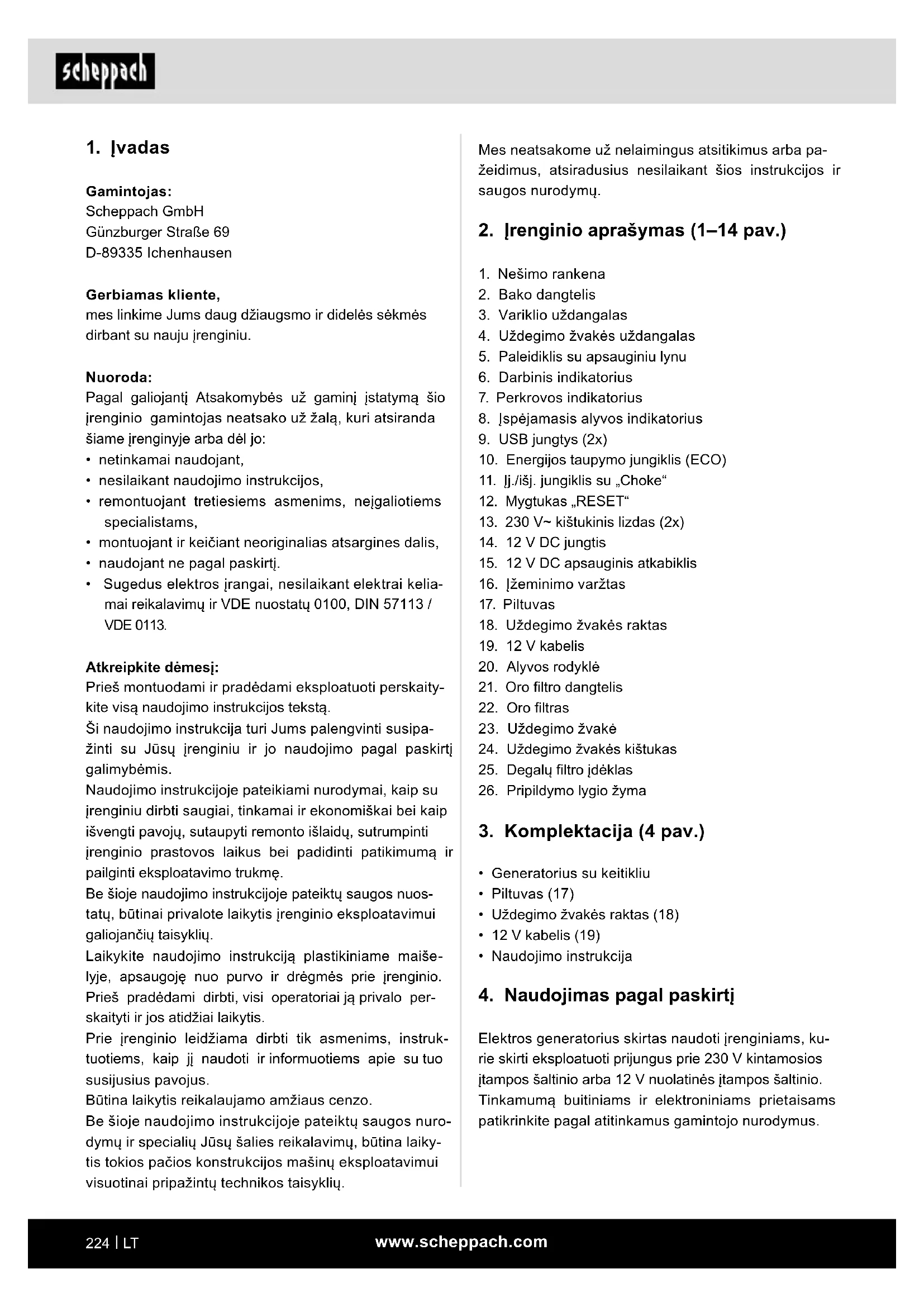- Sugedus elektros įrangai, nesilaikant elektrai kelia- mai reikalavimų ir VDE nuostatų 0100, DIN 57113 / VDE 0113. Atkreipkite dėmesį: Prieš montuodami ir pradėdami eksploatuoti perskaity- kite visą naudojimo instrukcijos tekstą. Ši naudojimo instrukcija turi Jums palengvinti susipa- žinti su Jūsų įrenginiu ir jo naudojimo pagal paskirtį galimybėmis. Naudojimo instrukcijoje pateikiami nurodymai, kaip su įrenginiu dirbti saugiai, tinkamai ir ekonomiškai bei kaip išvengti pavojų, sutaupyti remonto išlaidų, sutrumpinti įrenginio prastovos laikus bei padidinti patikimumą ir pailginti eksploatavimo trukmę. Be šioje naudojimo instrukcijoje pateiktų saugos nuos- tatų, būtinai privalote laikytis įrenginio eksploatavimui galiojančių taisyklių. Laikykite naudojimo instrukciją plastikiniame maiše- lyje, apsaugoję nuo purvo ir drėgmės prie įrenginio. Prieš pradėdami dirbti, visi operatoriai ją privalo per- skaityti ir jos atidžiai laikytis. Prie įrenginio leidžiama dirbti tik asmenims, instruk- tuotiems, kaip jį naudoti ir informuotiems apie su tuo susijusius pavojus. Būtina laikytis reikalaujamo amžiaus cenzo. Be šioje naudojimo instrukcijoje pateiktų saugos nuro- dymų ir specialių Jūsų šalies reikalavimų, būtina laiky- tis tokios pačios konstrukcijos mašinų eksploatavimui visuotinai pripažintų technikos taisyklių.www.scheppach.com