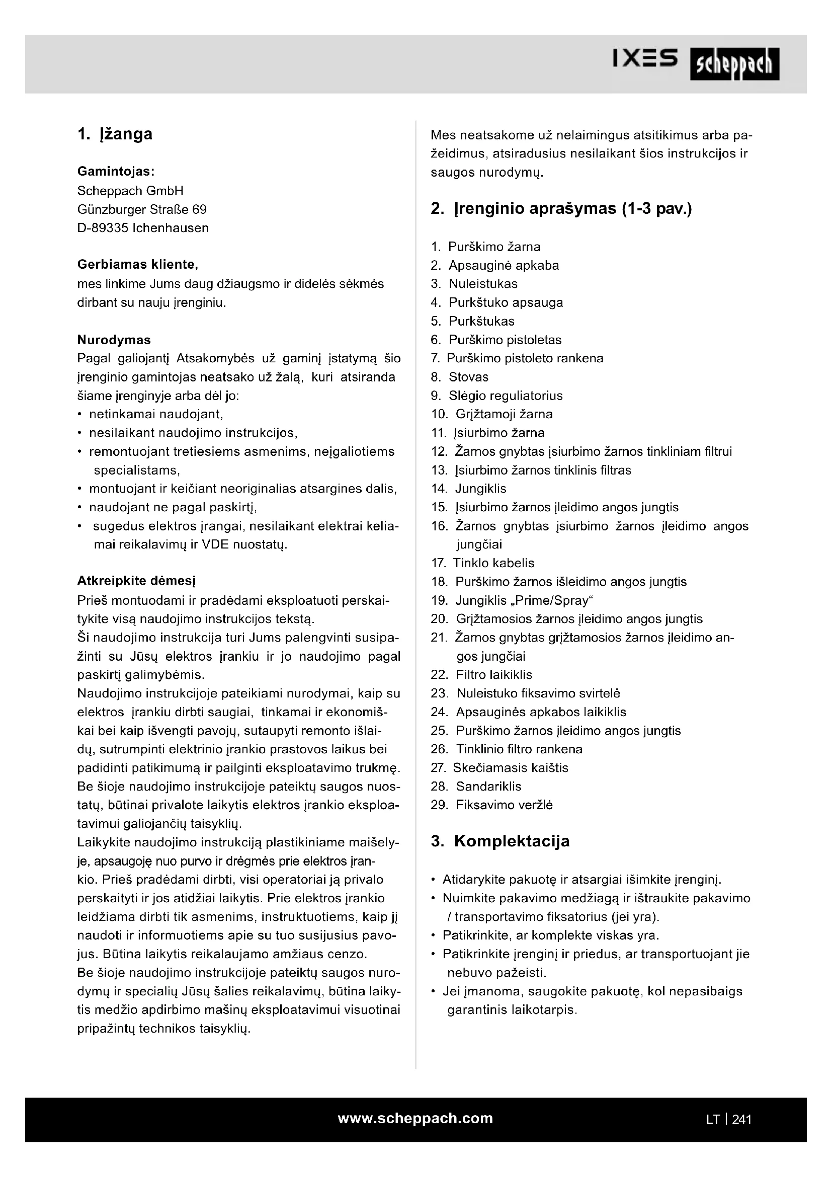 Gamintojas: Scheppach GmbH Günzburger Straße 69 D-89335 Ichenhausen Gerbiamas kliente, mes linkime Jums daug džiaugsmo ir didelės sėkmės dirbant su nauju įrenginiu. Nurodymas Pagal galiojantį Atsakomybės už gaminį įstatymą šio įrenginio gamintojas neatsako už žalą, kuri atsiranda šiame įrenginyje arba dėl jo: