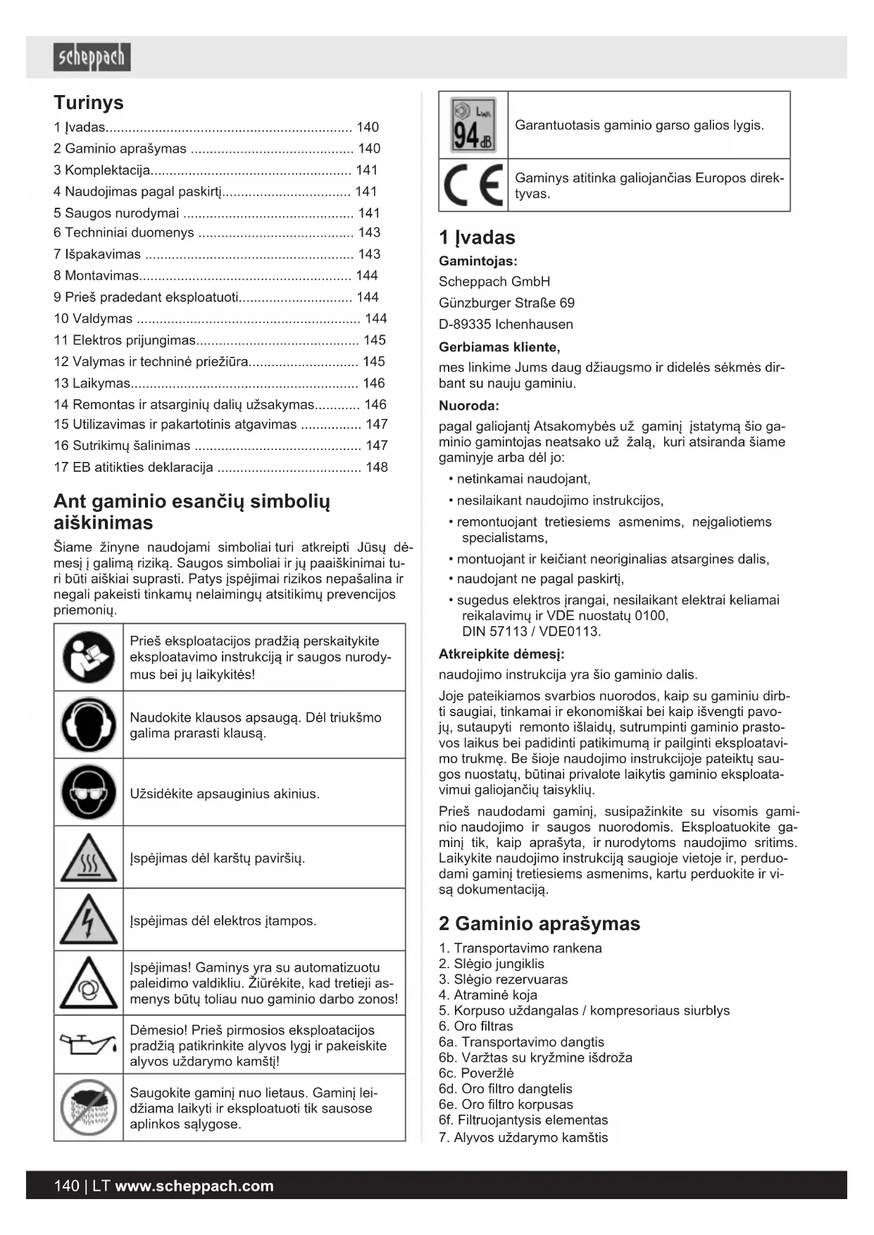 DĖMESIO Naudojant šį kompresorių, norint apsisaugoti nuo elek- tros smūgio, pavojaus susižaloti ir gaisro pavojaus, būti- na imtis pagrindinių saugos priemonių. Prieš naudoda- mi gaminį, perskaitykite šias nuorodas ir jų laikykitės. LT | 141www.scheppach.comSaugus darbas