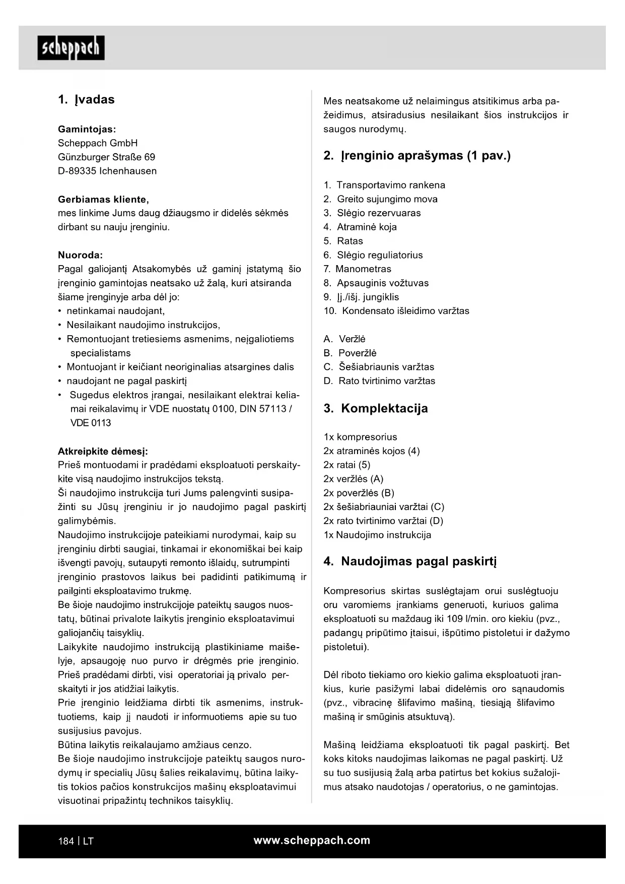 Gamintojas: Scheppach GmbH Günzburger Straße 69 D-89335 Ichenhausen Gerbiamas kliente, mes linkime Jums daug džiaugsmo ir didelės sėkmės dirbant su nauju įrenginiu. Nuoroda: Pagal galiojantį Atsakomybės už gaminį įstatymą šio įrenginio gamintojas neatsako už žalą, kuri atsiranda šiame įrenginyje arba dėl jo:
