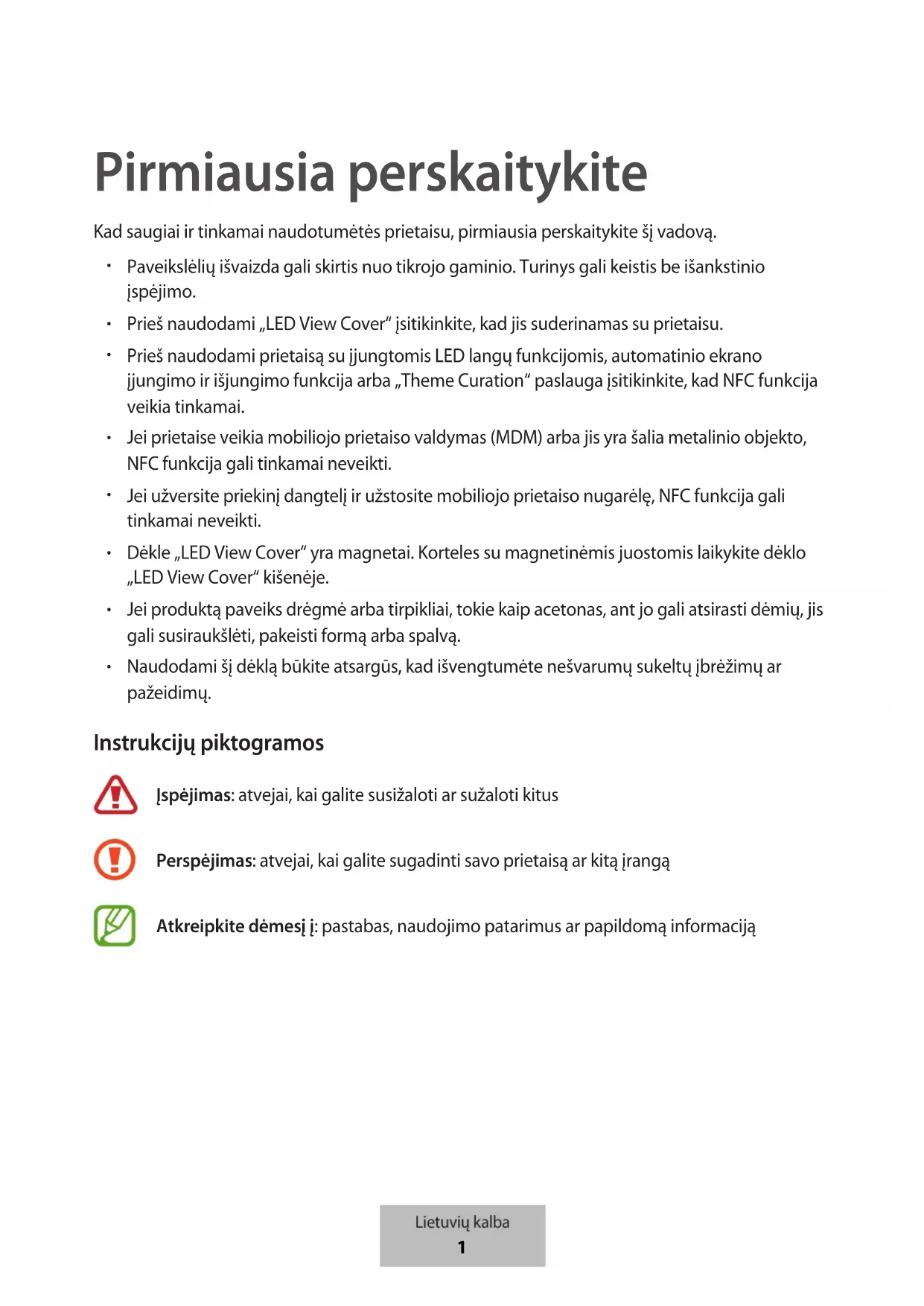 Priedai , tuomet naudokite LED piktogramos redagavimo funkciją. Taip pat galite naudoti LED piktogramų redagavimo programą, kuri atsiranda pritvirtinus „LED View Cover“ prie mobiliojo prietaiso. Lietuvių kalba 5Autoriaus teisės © Autoriaus teisės „Samsung Electronics Co., Ltd.“, 2020 Šis vadovas saugomas pagal tarptautinius autoriaus teisių įstatymus. Jokios šio vadovo dalies negalima perkurti, platinti, versti arba persiųsti bet kokia forma ir bet kokiu būdu: elektroniniu ar mechaniniu, įskaitant fotokopijavimą, įrašymą arba saugojimą bet kokiose informacijos laikymo ir gavimo sistemose. Prekių ženklai
