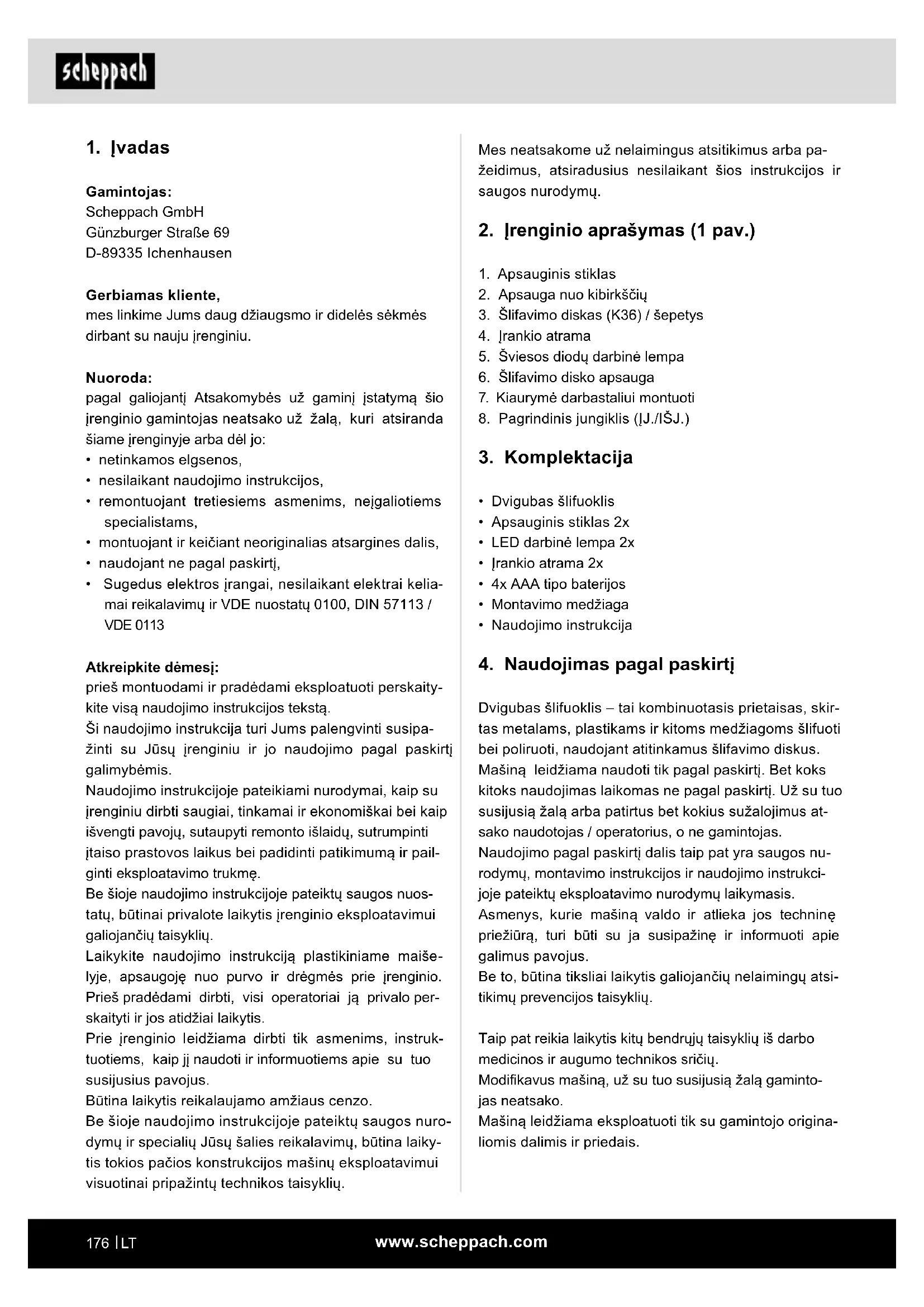 - Sugedus elektros įrangai, nesilaikant elektrai kelia- mai reikalavimų ir VDE nuostatų 0100, DIN 57113 / VDE 0113 Atkreipkite dėmesį: prieš montuodami ir pradėdami eksploatuoti perskaity- kite visą naudojimo instrukcijos tekstą. Ši naudojimo instrukcija turi Jums palengvinti susipa- žinti su Jūsų įrenginiu ir jo naudojimo pagal paskirtį galimybėmis. Naudojimo instrukcijoje pateikiami nurodymai, kaip su įrenginiu dirbti saugiai, tinkamai ir ekonomiškai bei kaip išvengti pavojų, sutaupyti remonto išlaidų, sutrumpinti įtaiso prastovos laikus bei padidinti patikimumą ir pail- ginti eksploatavimo trukmę. Be šioje naudojimo instrukcijoje pateiktų saugos nuos- tatų, būtinai privalote laikytis įrenginio eksploatavimui galiojančių taisyklių. Laikykite naudojimo instrukciją plastikiniame maiše- lyje, apsaugoję nuo purvo ir drėgmės prie įrenginio. Prieš pradėdami dirbti, visi operatoriai ją privalo per- skaityti ir jos atidžiai laikytis. Prie įrenginio leidžiama dirbti tik asmenims, instruk- tuotiems, kaip jį naudoti ir informuotiems apie su tuo susijusius pavojus. Būtina laikytis reikalaujamo amžiaus cenzo. Be šioje naudojimo instrukcijoje pateiktų saugos nuro- dymų ir specialių Jūsų šalies reikalavimų, būtina laiky- tis tokios pačios konstrukcijos mašinų eksploatavimui visuotinai pripažintų technikos taisyklių.www.scheppach.com