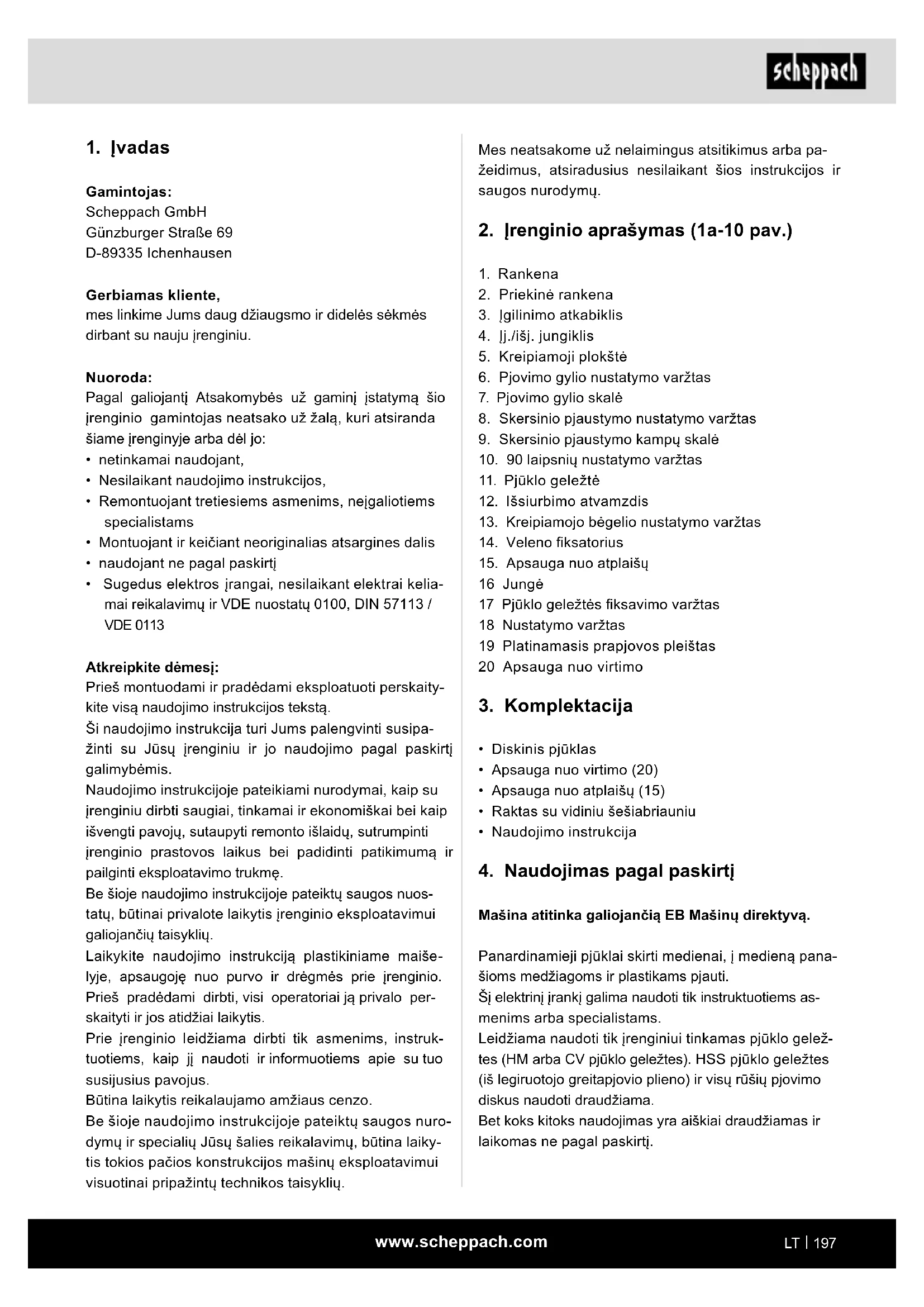 Gamintojas: Scheppach GmbH Günzburger Straße 69 D-89335 Ichenhausen Gerbiamas kliente, mes linkime Jums daug džiaugsmo ir didelės sėkmės dirbant su nauju įrenginiu. Nuoroda: Pagal galiojantį Atsakomybės už gaminį įstatymą šio įrenginio gamintojas neatsako už žalą, kuri atsiranda šiame įrenginyje arba dėl jo: