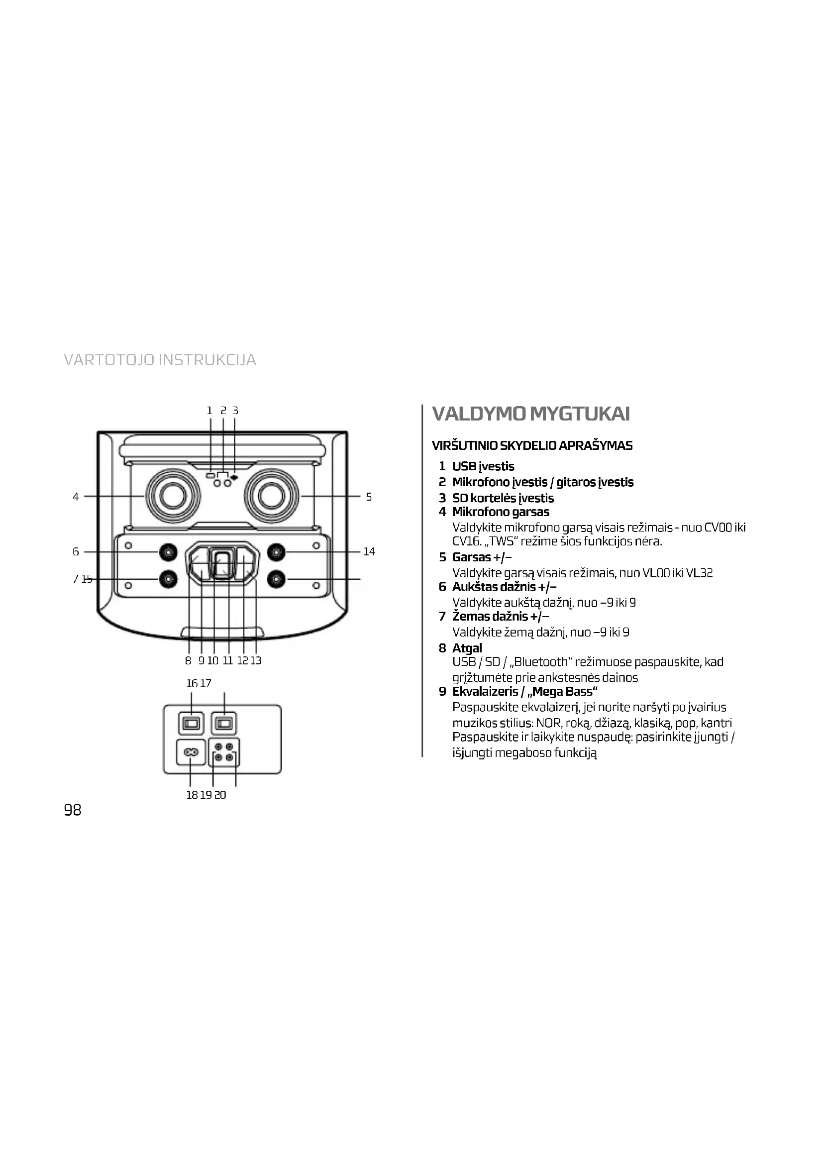 USB įvestis Mikrofono įvestis / gitaros įvestis SD kortelės įvestis Mikrofono garsas Valdykite mikrofono garsą visais režimais - nuo CV00 iki CV16. „TWS“ režime šios funkcijos nėra. Garsas +/– Valdykite garsą visais režimais, nuo VL00 iki VL32 Aukštas dažnis +/– Valdykite aukštą dažnį, nuo –9 iki 9 Žemas dažnis +/– Valdykite žemą dažnį, nuo –9 iki 9 Atgal USB / SD / „Bluetooth“ režimuose paspauskite, kad grįžtumėte prie ankstesnės dainos Ekvalaizeris / „Mega Bass“ Paspauskite ekvalaizerį, jei norite naršyti po įvairius muzikos stilius: NOR, roką, džiazą, klasiką, pop, kantri Paspauskite ir laikykite nuspaudę: pasirinkite įjungti / išjungti megaboso funkciją
