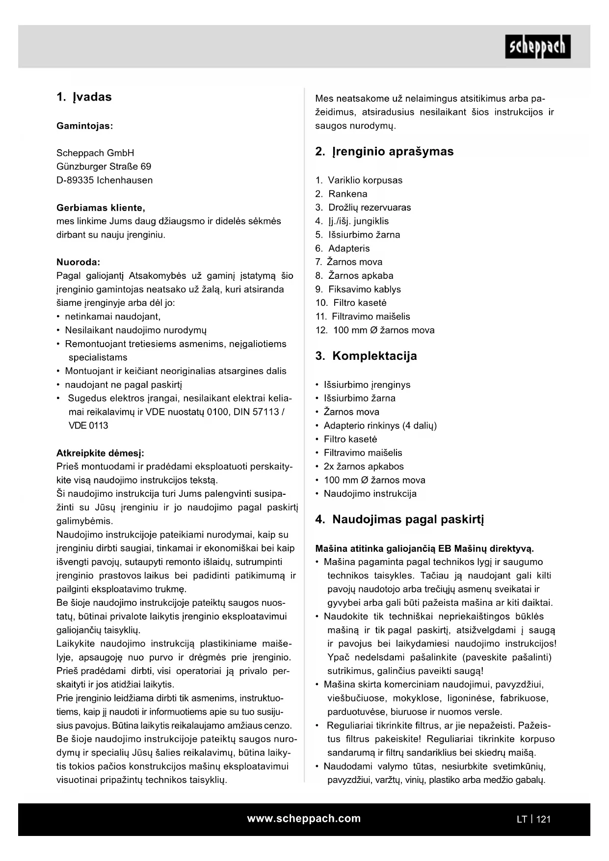 Gamintojas: Scheppach GmbH Günzburger Straße 69 D-89335 Ichenhausen Gerbiamas kliente, mes linkime Jums daug džiaugsmo ir didelės sėkmės dirbant su nauju įrenginiu. Nuoroda: Pagal galiojantį Atsakomybės už gaminį įstatymą šio įrenginio gamintojas neatsako už žalą, kuri atsiranda šiame įrenginyje arba dėl jo: