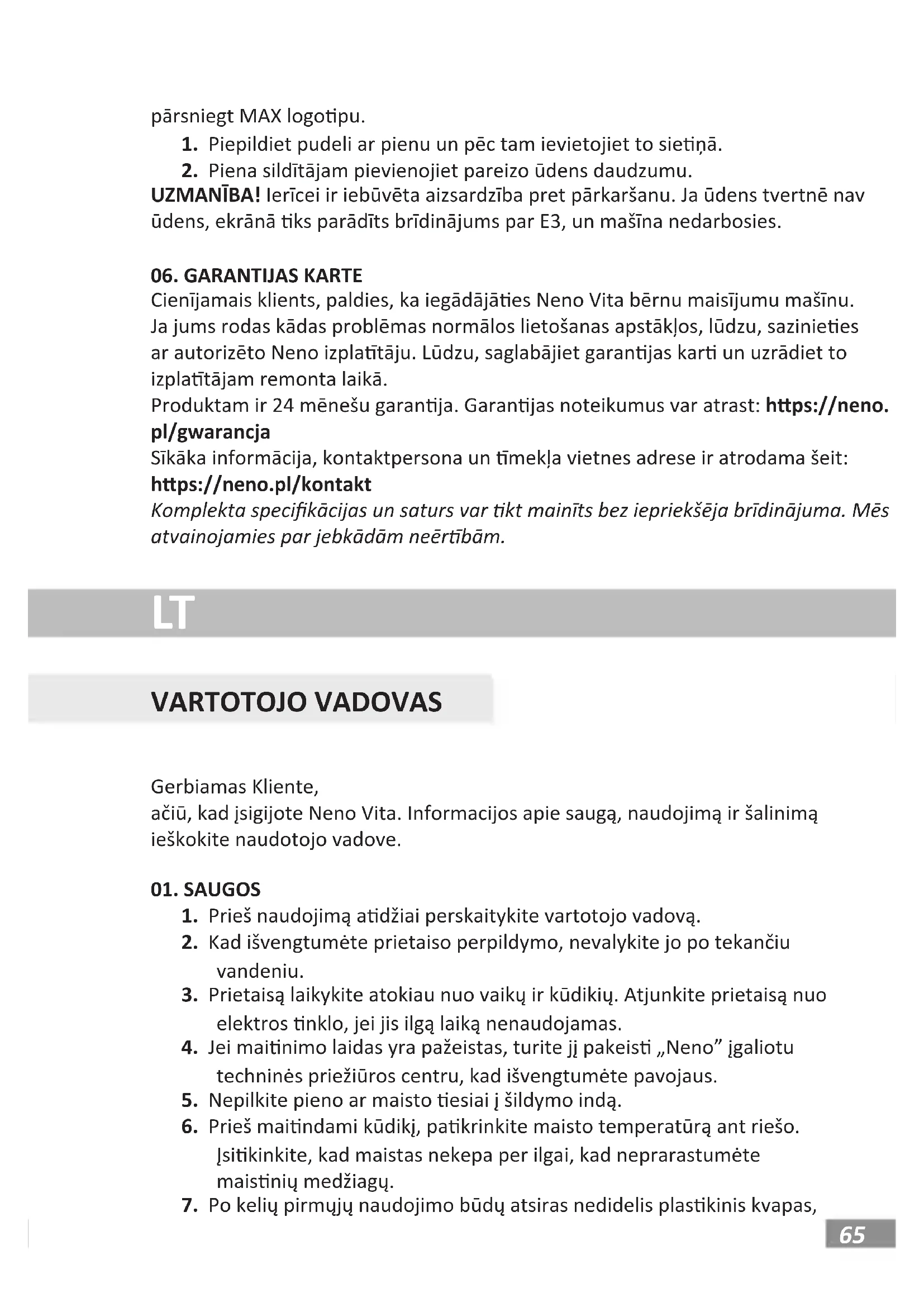 Gerbiamas kliente, dėkojame, kad įsigijote kūdikių mišinių aparatą „Neno Vita”. Jei turite kokių nors problemų įprastomis naudojimo sąlygomis, susisie- kite su įgaliotuojuNeno plantoju. Pasilikite garannę kortelę ir parodykite ją plantojui taisydami. Gaminiui taikoma 24 mėnesių garanja. Garanjos sąlygas galima ras: hps://neno.pl/gwarancja Išsamią informaciją, kontaknį adresą ir interneto svetainės adresą galima ras adresu: hps://neno.pl/kontakt Rinkinio specikacijos ir turinys gali bū keičiami be išanksnio įspėjimo. Atsiprašome už nepatogumus.