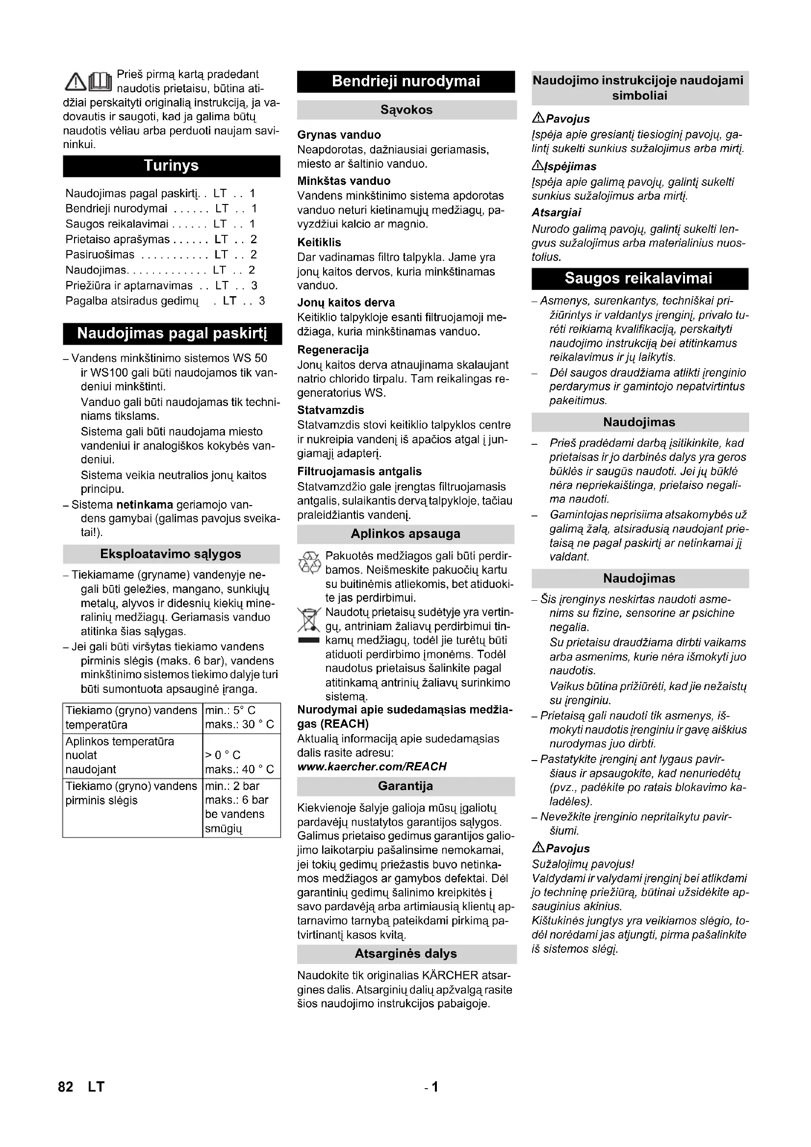 - 5 10,0 20,0 10 5,0 10,0 12 4,2 8,3 14 3,6 7,1 16 3,1 6,3 18 2,8 5,6 20 2,5 5,0 22 2,3 4,5 Mērinstruments Reģenerācija Novājinātas iekārtas reģenerācija Sveķu pildījuma nomaiņa rezervuārā Kopšana un tehniskā apkope Vispārējas piezīmes Sasaluma risks Rezervuāra iztukšošana sala draudu ga- dījumā Apkopes darbi Ikdienas pārbaudes pirms ekspluatācijas Apkope ik pēc 3 mēnešiem Traucējumu novēršana Nav mīkstā ūdens Sveķu noplūde Sūce 81LV- 1 Prieš pirmą kartą pradedant naudotis prietaisu, būtina ati- džiai perskaityti originalią instrukciją, ja va- dovautis ir saugoti, kad ja galima būtų naudotis vėliau arba perduoti naujam savi- ninkui. – Vandens minkštinimo sistemos WS 50 ir WS100 gali būti naudojamos tik van- deniui minkštinti. Vanduo gali būti naudojamas tik techni- niams tikslams. Sistema gali būti naudojama miesto vandeniui ir analogiškos kokybės van- deniui. Sistema veikia neutralios jonų kaitos principu. – Sistema netinkama geriamojo van- dens gamybai (galimas pavojus sveika- tai!). – Tiekiamame (gryname) vandenyje ne- gali būti geležies, mangano, sunkiųjų metalų, alyvos ir didesnių kiekių mine- ralinių medžiagų. Geriamasis vanduo atitinka šias sąlygas. – Jei gali būti viršytas tiekiamo vandens pirminis slėgis (maks. 6 bar), vandens minkštinimo sistemos tiekimo dalyje turi būti sumontuota apsauginė įranga. Neapdorotas, dažniausiai geriamasis, miesto ar šaltinio vanduo. Vandens minkštinimo sistema apdorotas vanduo neturi kietinamųjų medžiagų, pa- vyzdžiui kalcio ar magnio. Dar vadinamas filtro talpykla. Jame yra jonų kaitos dervos, kuria minkštinamas vanduo. Keitiklio talpykloje esanti filtruojamoji me- džiaga, kuria minkštinamas vanduo. Jonų kaitos derva atnaujinama skalaujant natrio chlorido tirpalu. Tam reikalingas re- generatorius WS. Statvamzdis stovi keitiklio talpyklos centre ir nukreipia vandenį iš apačios atgal į jun- giamąjį adapterį. Statvamzdžio gale įrengtas filtruojamasis antgalis, sulaikantis dervą talpykloje, tačiau praleidžiantis vandenį. Pakuotės medžiagos gali būti perdir- bamos. Neišmeskite pakuočių kartu su buitinėmis atliekomis, bet atiduoki- te jas perdirbimui. Naudotų prietaisų sudėtyje yra vertin- gų, antriniam žaliavų perdirbimui tin- kamų medžiagų, todėl jie turėtų būti atiduoti perdirbimo į monėms. Todėl naudotus prietaisus šalinkite pagal atitinkamą antrinių žaliavų surinkimo sistemą. Nurodymai apie sudedamąsias medžia- gas (REACH) Aktualią informaciją apie sudedamąsias dalis rasite adresu: www.kaercher.com/REACH Kiekvienoje šalyje galioja mūsų įgaliotų pardavėjų nustatytos garantijos sąlygos. Galimus prietaiso gedimus garantijos galio- jimo laikotarpiu pašalinsime nemokamai, jei tokių gedimų priežastis buvo netinka- mos medžiagos ar gamybos defektai. Dėl garantinių gedimų šalinimo kreipkitės į savo pardavėją arba artimiausią klientų ap- tarnavimo tarnybą pateikdami pirkimą pa- tvirtinantį kasos kvitą. Naudokite tik originalias KÄRCHER atsar- gines dalis. Atsarginių dalių apžvalgą rasite šios naudojimo instrukcijos pabaigoje. Pavojus Įspėja apie gresiantį tiesioginį pavojų, ga- lintį sukelti sunkius sužalojimus arba mirtį. 몇 Įspėjimas Įspėja apie galimą pavojų, galintį sukelti sunkius sužalojimus arba mirtį. Atsargiai Nurodo galimą pavojų, galintį sukelti len- gvus sužalojimus arba materialinius nuos- tolius. – Asmenys, surenkantys, techniškai pri- žiūrintys ir valdantys įrenginį, privalo tu- rėti reikiamą kvalifikaciją, perskaityti naudojimo instrukciją bei atitinkamus reikalavimus ir jų laikytis. – Dėl saugos draudžiama atlikti įrenginio perdarymus ir gamintojo nepatvirtintus pakeitimus. – Prieš pradėdami darbą įsitikinkite, kad prietaisas ir jo darbinės dalys yra geros būklės ir saugūs naudoti. Jei jų būklė nėra nepriekaištinga, prietaiso negali- ma naudoti. – Gamintojas neprisiima atsakomybės už galimą žalą, atsiradusią naudojant prie- taisą ne pagal paskirtį ar netinkamai jį valdant. – Šis įrenginys neskirtas naudoti asme- nims su fizine, sensorine ar psichine negalia. Su prietaisu draudžiama dirbti vaikams arba asmenims, kurie nėra išmokyti juo naudotis. Vaikus būtina prižiūrėti, kad jie nežaistų su įrenginiu. – Prietaisą gali naudoti tik asmenys, iš- mokyti naudotis įrenginiu ir gavę aiškius nurodymas juo dirbti. – Pastatykite įrenginį ant lygaus pavir- šiaus ir apsaugokite, kad nenuriedėtų (pvz., padėkite po ratais blokavimo ka- ladėles). – Nevežkite įrenginio nepritaikytu pavir- šiumi. Pavojus Sužalojimų pavojus! Valdydami ir valydami įrenginį bei atlikdami jo techninę priežiūrą, būtinai užsidėkite ap- sauginius akinius. Kištukinės jungtys yra veikiamos slėgio, to- dėl norėdami jas atjungti, pirma pašalinkite iš sistemos slėgį. Turinys Naudojimas pagal paskirtį