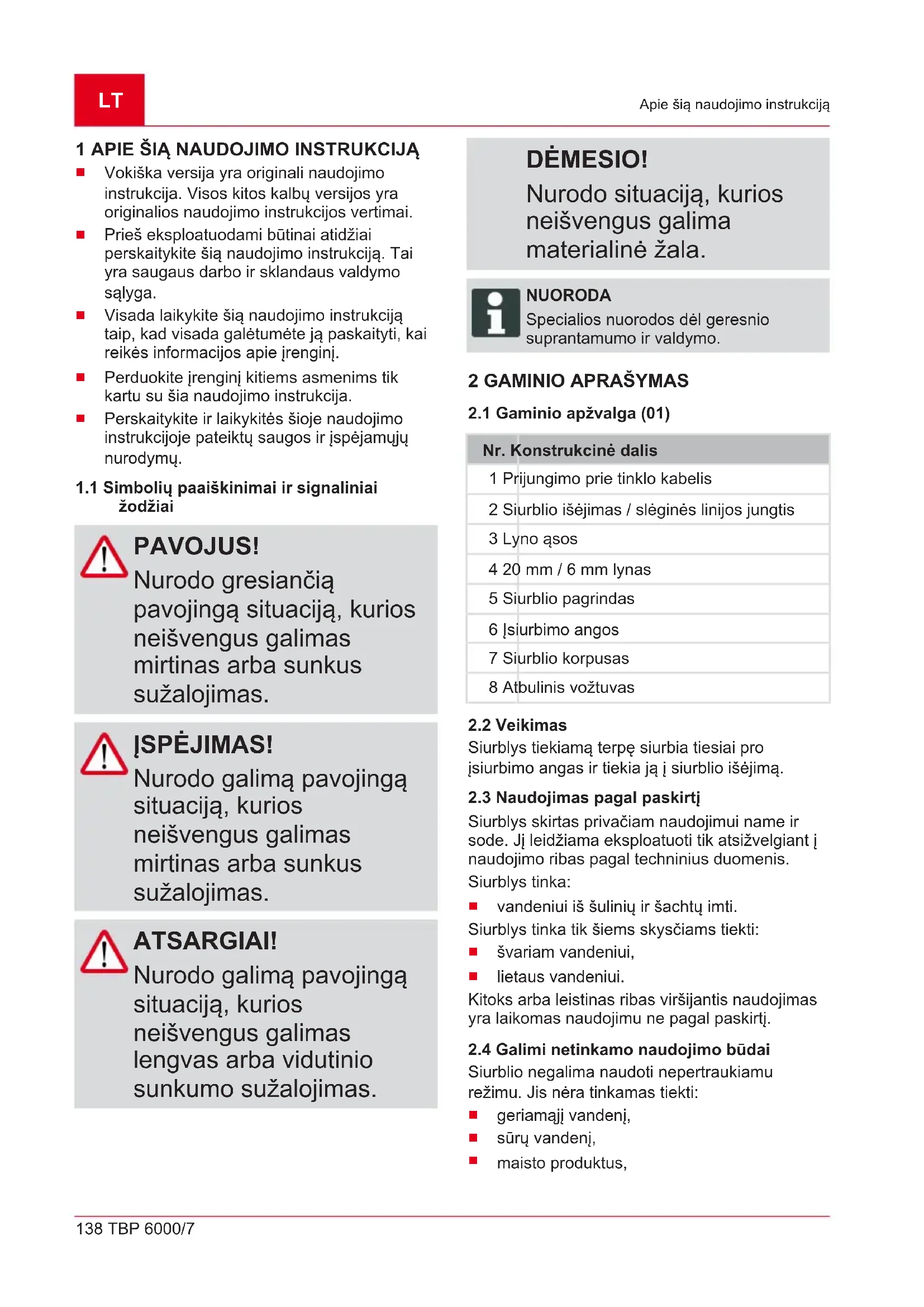 Siurblys skirts privaciam naudojimui name ir sode. JI leidziama eksploatuoti tik atsiizvelgiant j naudojimo ribas pagal techninius duomenis.