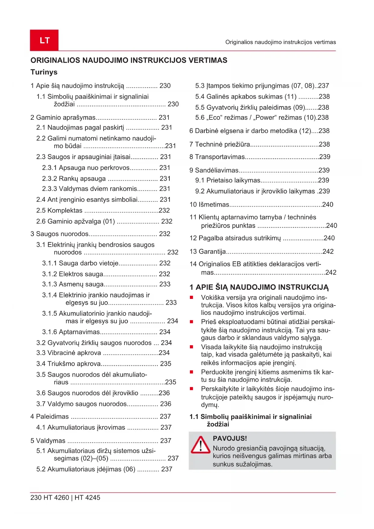 Pareiškiame, kad šis rinkai pateiktos formos gaminys atitinka darniųjų ES direktyvų, ES saugos stan- dartų ir gaminiui taikomų standartų reikalavimus. Gaminys Akumuliatorinės gyvatvorių žirklės Serijos numeris G2033022 Gamintojas AL-KO Geräte GmbH Ichenhauser Str. 14 D-89359 Kötz Už dokumentaciją atsakingas asmuo Andreas Hedrich Ichenhauser Str. 14 D-89359 Kötz Tipas HT 4260 HT 4245 Garso galios lygis EN ISO 3744 išmatuotas / garantuojamas 93,1dB(A) / 95dB(A) ES direktyvos 2006/42/EB 2014/30/ES 2000/14/EB 2011/65/ES Atitikties deklaracija 2000/14/EB V priedas Darnieji standartai EN 60745-1:2009+A11:2010 EN 60745-2-15:2009+A1:2010 EN 55014-1:2006+A1:2009+A2:2011 EN 55014-2:2015 Kötz, 16.05.2018 Dr. Wolfgang Hergeth Generalinis direktorius442203_b 243 Oriģinālās lietošanas instrukcijas tulkojums ORIĢINĀLĀS LIETOŠANAS INSTRUKCIJAS TULKOJUMS Saturs 1 Par šo lietošanas instrukciju .................... 243