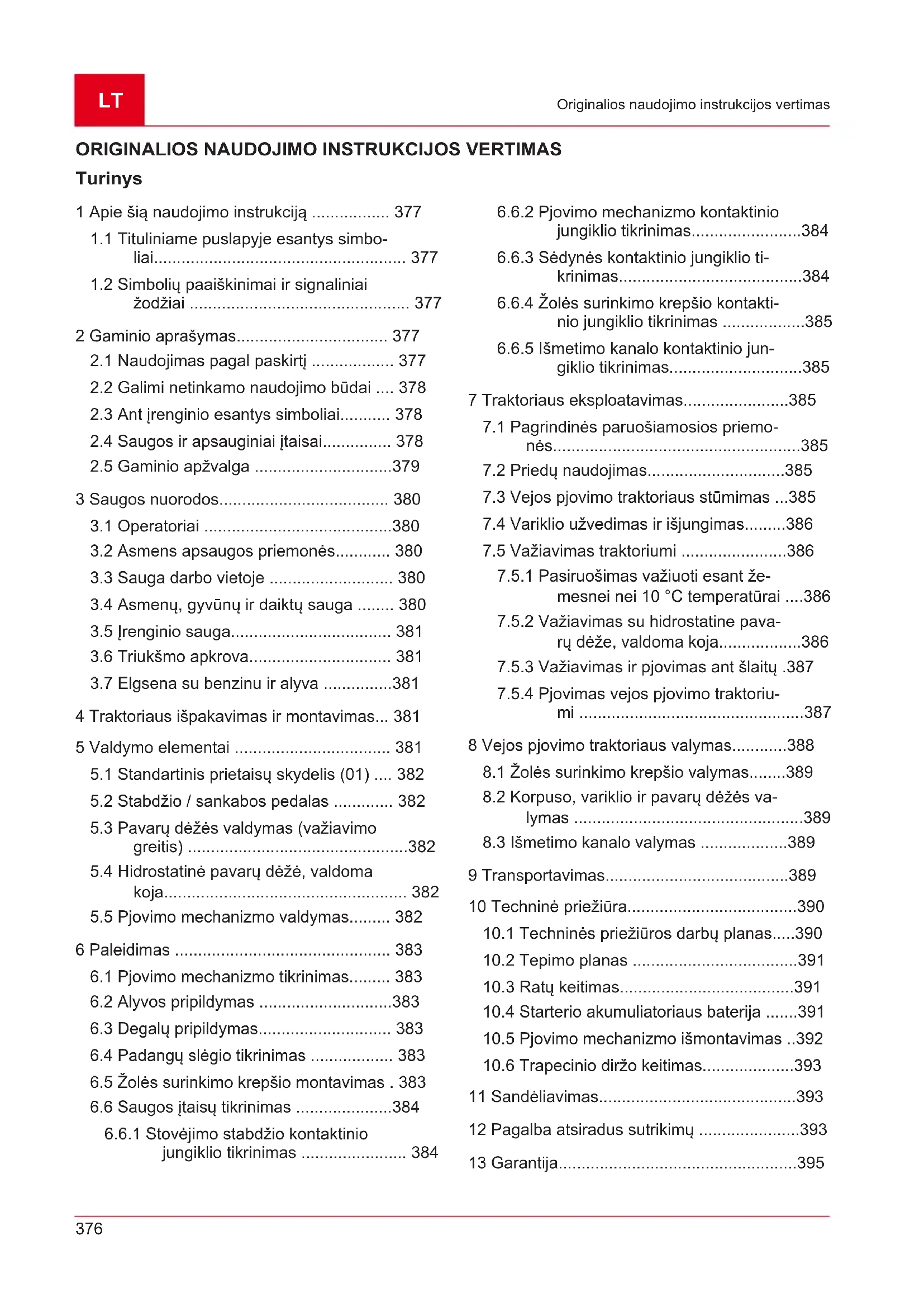 Pagalba atsiradus sutrikimų Sutrikimas Priežastis Šalinimas Dėl kelių mėginimų užvesti per daug degalų variklio degimo ka- meroje. Išsukite ir nusausinkite uždegimo žvakę. Neveikia paleidiklis. Išeikvota arba silpna starterio akumuliatorių baterija. Įkraukite starterio akumuliatorių bateriją. Neveikia apsauginis jungiklis prie vairuotojo sėdynės. Tinkamai atsisėskite ant vairuotojo sė- dynės; jungiklis sugedęs. Neveikia apsauginis jungiklis prie stabdžio pedalo. Iki galo nuspauskite stabdžio pedalą. Pjovimo mechanizmas įjungtas. Išjunkite pjovimo mechanizmą. Starterio akumuliatorių baterijos (+) kabelio saugiklis. Patikrinkite arba prireikus pakeiskite saugiklį. Mažėja variklio galia. Per aukšta arba per drėgna žolė. Pakoreguokite pjovimo aukštį; šiek tiek pavažiuokite atgal ir taip padarykite vie- tos pjovimo mechanizmui. Užsikišo išmetimo kanalas / pjo- vimo deka. Išjunkite variklį ir ištraukite uždegimo raktelį! Išvalykite išmetimo kanalą / pjovimo de- ką. Nešvarus oro filtras. Išvalykite oro filtrą (žr. variklio gamintojo pateiktą naudojimo instrukciją). Netinkama karbiuratoriaus padė- tis. Paveskite patikrinti nustatymą (klientų aptarnavimo tarnybos dirbtuvės). Stipriai susidėvėjęs peilis. Pakeiskite peilį (klientų aptarnavimo tar- nybos dirbtuvės). Per didelis važiavimo greitis. Sumažinkite važiavimo greitį. Stipriai vibruoja vejos pjovimo traktorius. Pažeistas pjovimo mechaniz- mas. Patikrinkite pjovimo mechanizmą (klien- tų aptarnavimo tarnybos dirbtuvės). Vejos pjovimo trakto- rius nepradeda va- žiuoti. Esant hidrostatinei pavarai: nėra važiavimo pavaros. Perjunkite apvedimo svirtį į darbinę pa- dėtį (žr. Skyrius 7.3 "Vejos pjovimo trak- toriaus stūmimas", puslapis385). Netolygiai pjaunama. Susidėvėję, nešvarūs peiliai. Pakeiskite arba pagaląskite peilius. Pa- galąstus peilius subalansuokite (klientų aptarnavimo tarnybos dirbtuvės)! Netinkamas pjovimo aukštis. Pakoreguokite pjovimo aukštį. Per mažas variklio sūkių skai- čius. Nustatykite maksimalų variklio sūkių skaičių. Per didelis važiavimo greitis. Sumažinkite važiavimo greitį. Skirtingas padangų slėgis ratuo- se. Pripūskite iki tinkamo oro slėgio. Pažiū- rėkite padangoje, ar tinkamas jos slėgis. Žolės surinkimo krep- šys nesipildo. Nustatytas per mažas pjovimo aukštis. Pakoreguokite pjovimo aukštį.395 Garantija Sutrikimas Priežastis Šalinimas Žolė drėgna – ji per sunki, kad ją būtų galima transportuoti oro srautu. Atidėkite pjovimą, kol veja išdžius. Stipriai susidėvėjęs peilis. Pakeiskite peilį. (Klientų aptarnavimo tarnybos dirbtuvės) Veja per aukšta. Pjaukite veją 2 kartus: