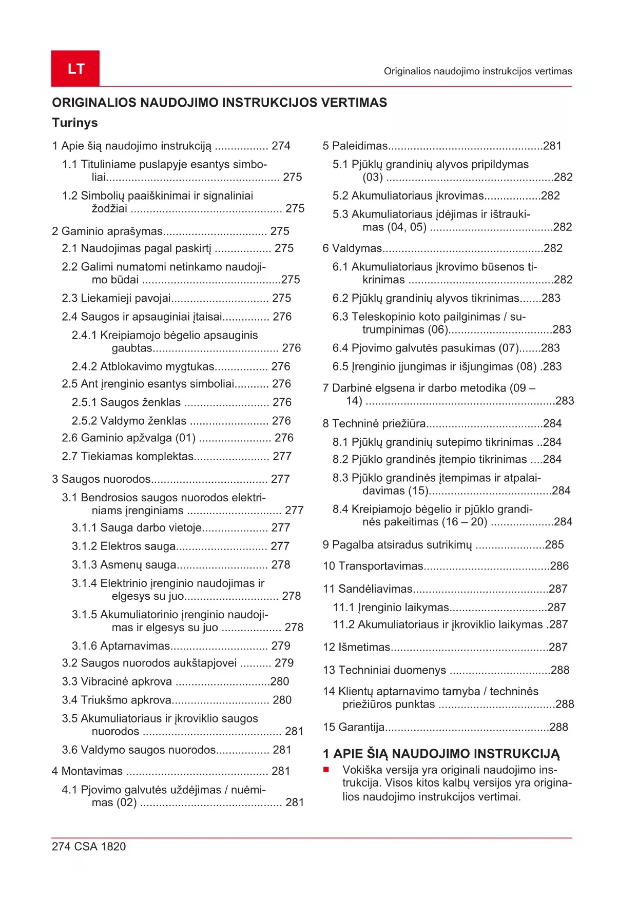 Baterijų arba akumuliatorių savininkas arba naudotojas juos panaudojęs įstatymais yra įpareigotas juos grąžinti. Grąžinti galima bui- tyje įprastai naudojamą kiekį. Senose baterijose gali būti kenksmingų medžiagų arba sunkiųjų metalų, kurie gali sukelti žalą aplin- kai ir sveikatai. Senų baterijų panaudojimas irLT 288 CSA 1820 Techniniai duomenys naudojimas jų sudėtyje esančių išteklių prisideda prie šių abiejų prekių apsaugos. Perbraukto atliekų konteinerio simbolis reiškia, kad baterijas ir akumuliatorius draudžiama išmes- ti su buitinėmis atliekomis. Jei po atliekų konteineriu yra tokie ženklai Hg, Cd arba Pb, jie reiškia: