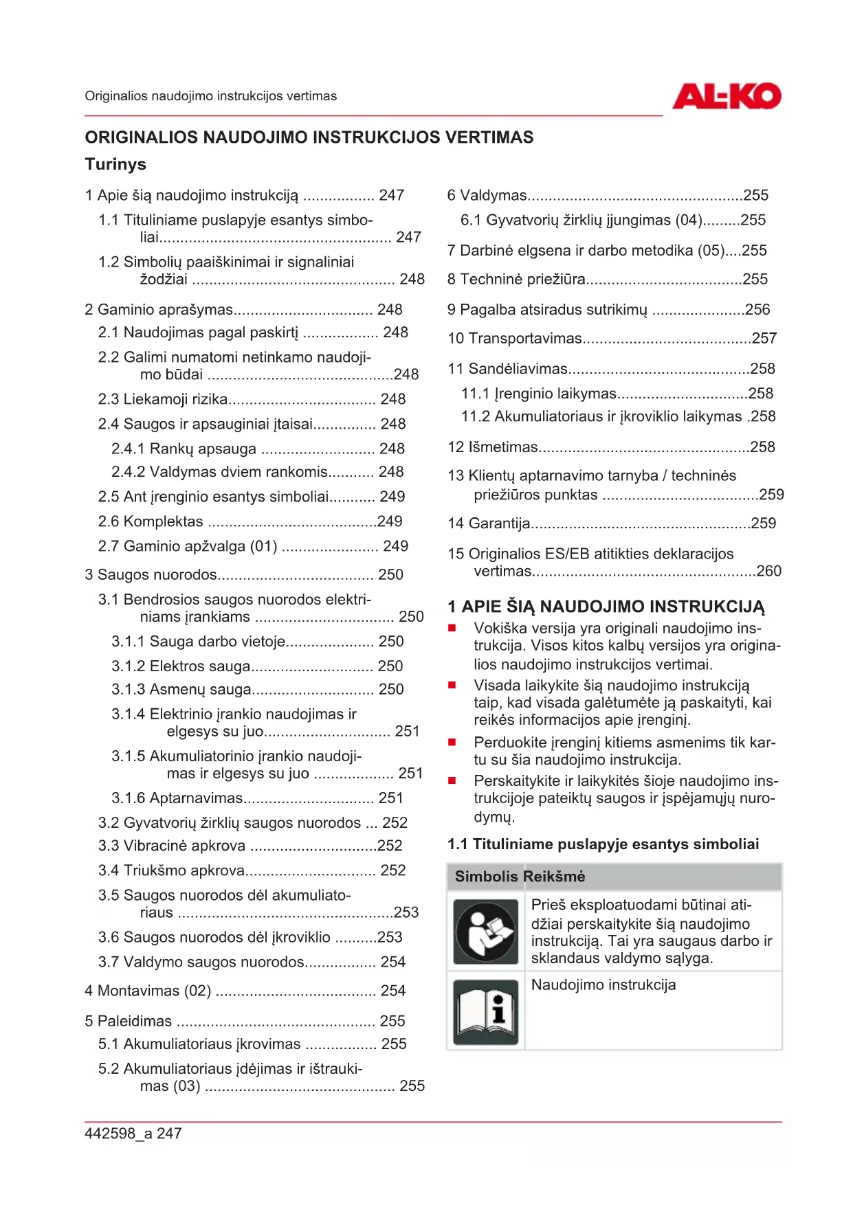 Simbolis Reikšmė Prieš eksploatuodami būtinai ati- džiai perskaitykite šią naudojimo instrukciją. Tai yra saugaus darbo ir sklandaus valdymo sąlyga. Naudojimo instrukcijaLT 248 HT 2000 Gaminio aprašymas Simbolis Reikšmė