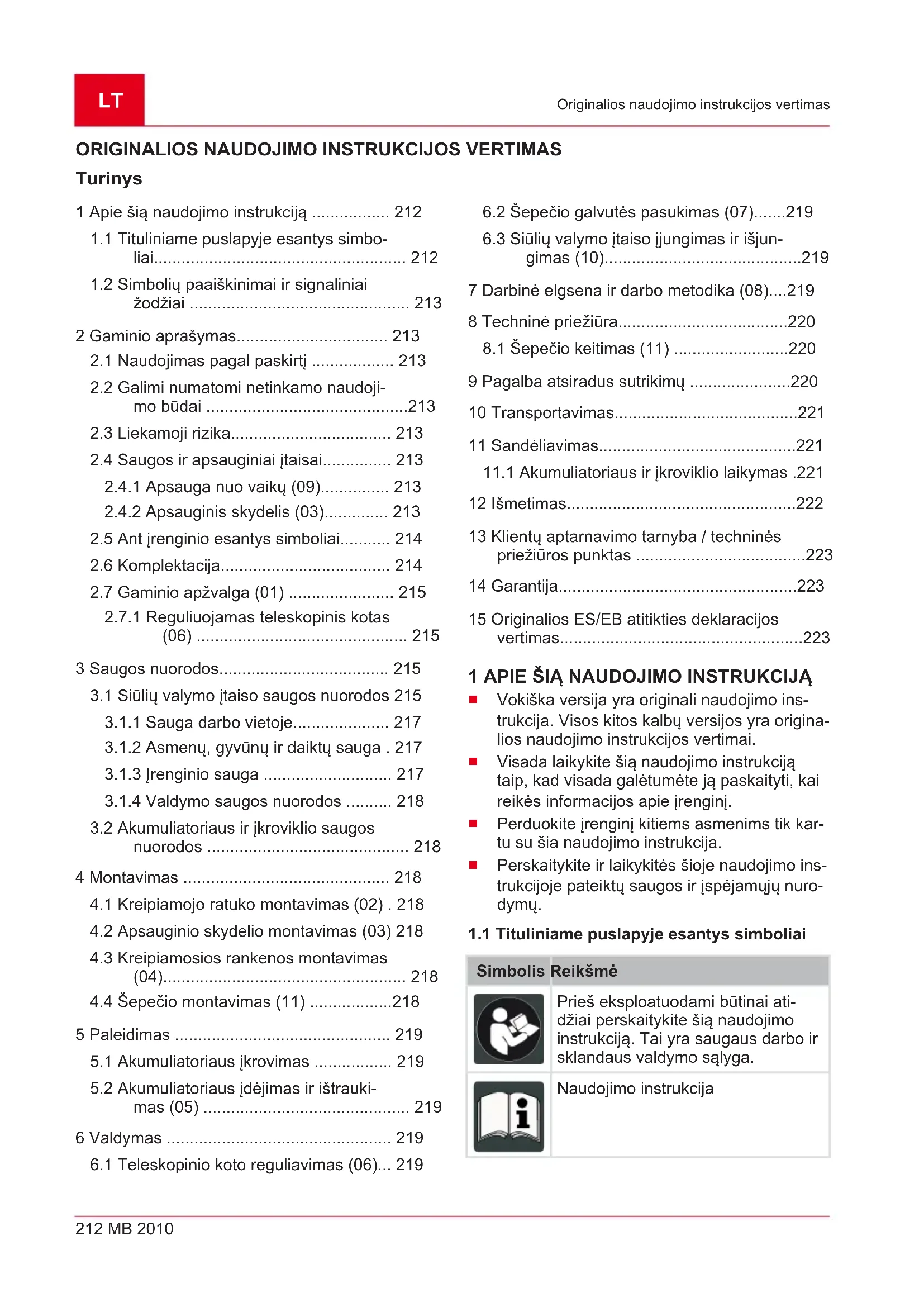 Šiuo prisiimdami sau atsakomybę deklaruojame, kad šis rinkai pateiktos formos gaminys atitinka dar- niųjų ES direktyvų, ES saugos standartų ir gaminiui taikomų standartų reikalavimus. Gaminys Akumuliatorinis siūlių valy- mo įtaisas Serijos numeris G4990012 Gamintojas AL-KO Geräte GmbH Ichenhauser Str. 14 D-89359 Kötz Už dokumentaciją atsakingas asmuo Andreas Hedrich Ichenhauser Str. 14 D-89359 Kötz Tipas MB 2010 ES direktyvos 2006/42/EC 2014/30/EU 2011/65/EU Darnieji standartai EN 60745-1:2009+A11:2010 EN 786:1996+A2:2009 EN 55014-1:2017 EN 55014-2:2015 Kötz, 2018-11-15 Dr. Wolfgang Hergeth Generalinis direktoriusLV 224 MB 2010 Oriģinālās lietošanas instrukcijas tulkojums ORIĢINĀLĀS LIETOŠANAS INSTRUKCIJAS TULKOJUMS Saturs 1 Par šo lietošanas instrukciju .................... 224