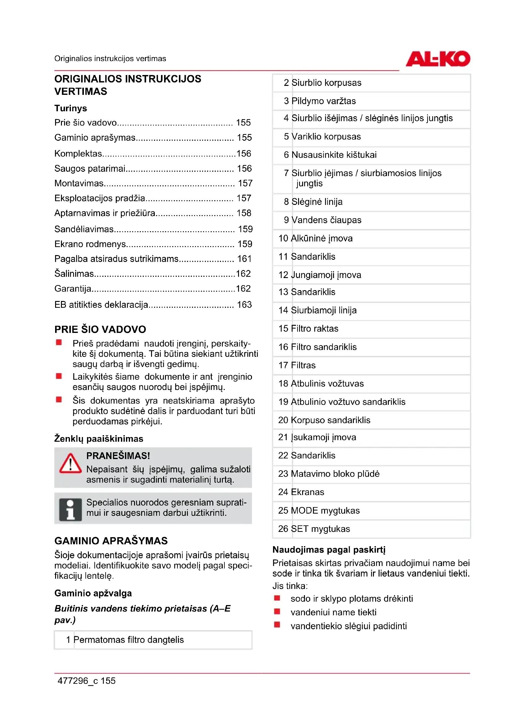 Šioje dokumentacijoje aprašomi įvairūs prietaisų modeliai. Identifikuokite savo modelį pagal speci- fikacijų lentelę. Gaminio apžvalga Buitinis vandens tiekimo prietaisas (A–E pav.) 1 Permatomas filtro dangtelis 2 Siurblio korpusas 3 Pildymo varžtas 4 Siurblio išėjimas / slėginės linijos jungtis 5 Variklio korpusas 6 Nusausinkite kištukai 7 Siurblio įėjimas / siurbiamosios linijos jungtis 8 Slėginė linija 9 Vandens čiaupas 10 Alkūninė įmova 11 Sandariklis 12 Jungiamoji įmova 13 Sandariklis 14 Siurbiamoji linija 15 Filtro raktas 16 Filtro sandariklis 17 Filtras 18 Atbulinis vožtuvas 19 Atbulinio vožtuvo sandariklis 20 Korpuso sandariklis 21 Įsukamoji įmova 22 Sandariklis 23 Matavimo bloko plūdė 24 Ekranas 25 MODE mygtukas 26 SET mygtukas Naudojimas pagal paskirtį Prietaisas skirtas privačiam naudojimui name bei sode ir tinka tik švariam ir lietaus vandeniui tiekti. Jis tinka: sodo ir sklypo plotams drėkinti vandeniui name tiekti vandentiekio slėgiui padidintilt Gaminio aprašymas
