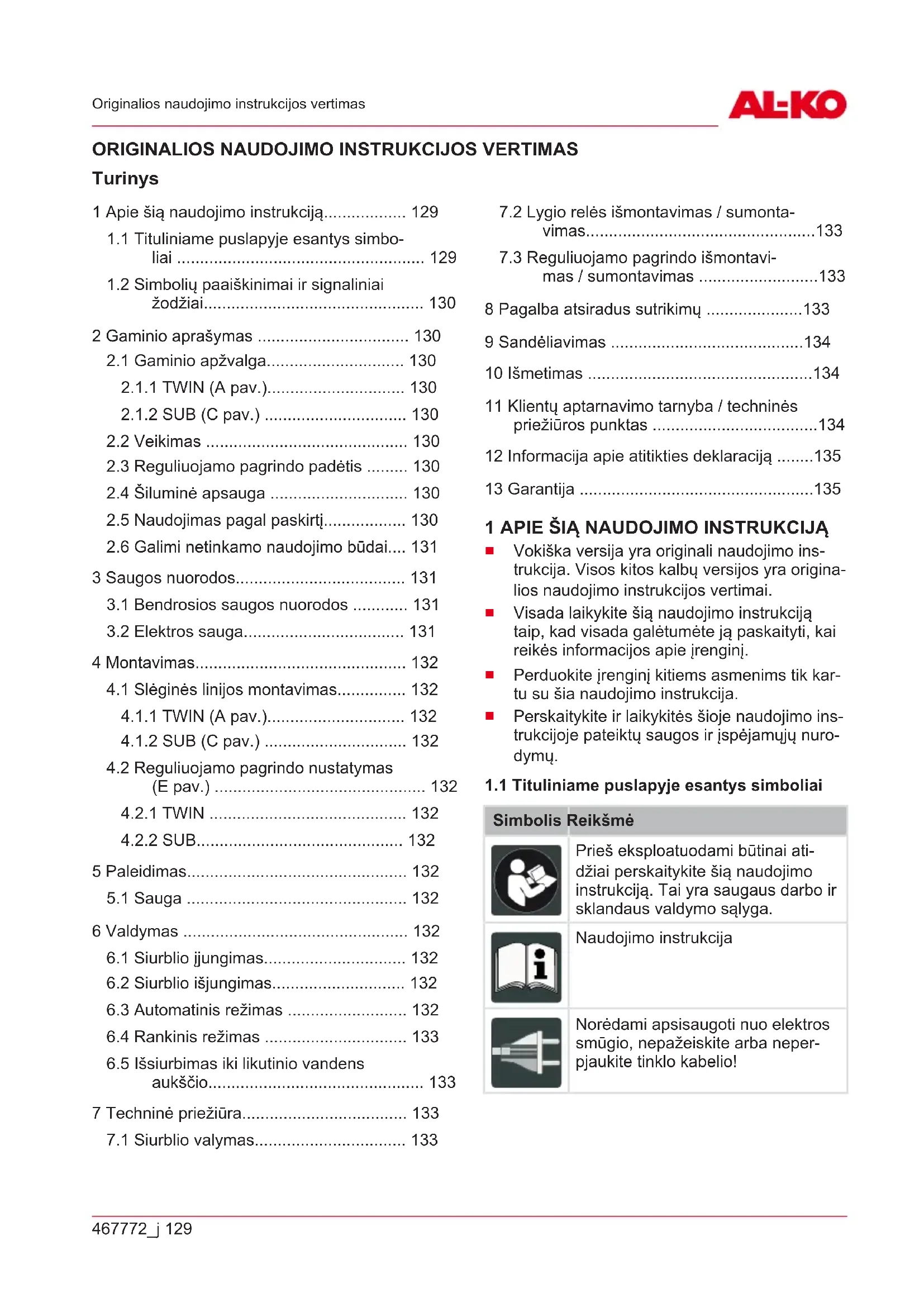 Iškilus klausimų dėl garantijos, remonto ir atsargi- nių dalių, kreipkitės į savo artimiausią AL-KO techninės priežiūros skyrių. Jį rasite internete to- kiu adresu: www.alko-garden.com/service-contacts Daugiau informacijos apie atsargines dalis rasite: www.alko-garden.com/spareparts467772_j 135 Informacija apie atitikties deklaraciją
