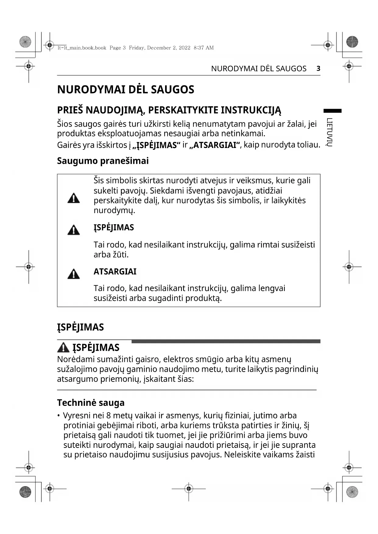 - Vyresni nei 8 metų vaikai ir asmenys, kurių fiziniai, jutimo arba protiniai gebėjimai riboti, arba kuriems trūksta patirties ir žinių, šį prietaisą gali naudoti tik tuomet, jei jie prižiūrimi arba jiems buvo suteikti nurodymai, kaip saugiai naudoti prietaisą, ir jei jie supranta su prietaiso naudojimu susijusius pavojus. Neleiskite vaikams žaisti Šis simbolis skirtas nurodyti atvejus ir veiksmus, kurie gali sukelti pavojų. Siekdami išvengti pavojaus, atidžiai perskaitykite dalį, kur nurodytas šis simbolis, ir laikykitės nurodymų. ĮSPĖJIMAS Tai rodo, kad nesilaikant instrukcijų, galima rimtai susižeisti arba žūti. ATSARGIAI Tai rodo, kad nesilaikant instrukcijų, galima lengvai susižeisti arba sugadinti produktą. lt-lt_main.book.book Page 3 Friday, December 2, 2022 8:37 AM4