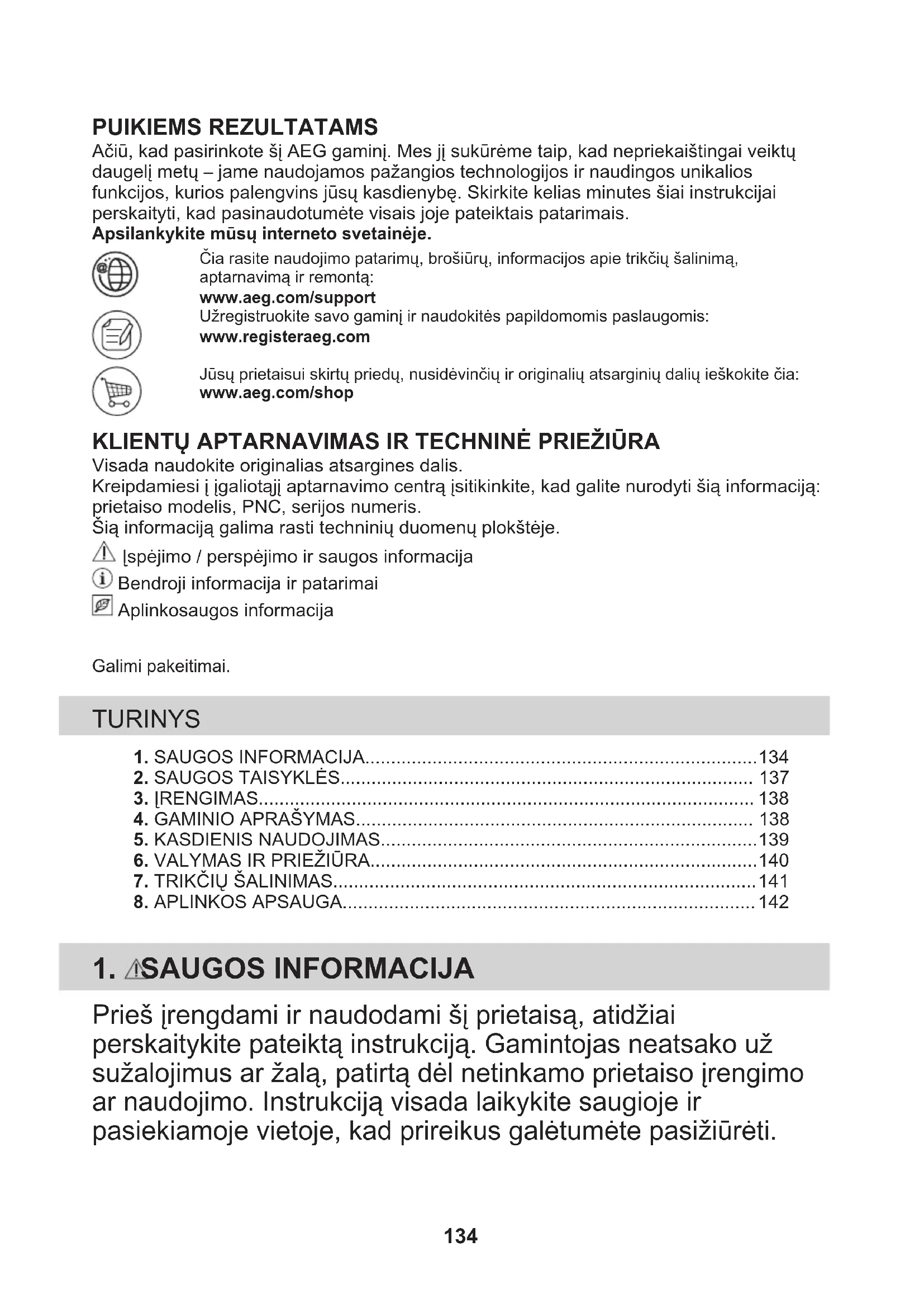 - Dėl prietaiso remonto kreipkitės į įgaliotąjį techninės priežiūros centrą. Naudokite tik originalias atsargines dalis.