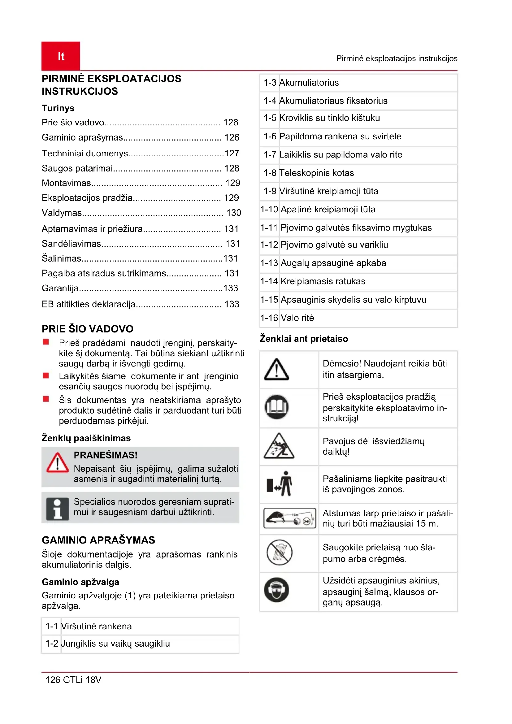 Šioje dokumentacijoje yra aprašomas rankinis akumuliatorinis dalgis. Gaminio apžvalga Gaminio apžvalgoje (1) yra pateikiama prietaiso apžvalga. 1-1 Viršutinė rankena 1-2 Jungiklis su vaikų saugikliu 1-3 Akumuliatorius 1-4 Akumuliatoriaus fiksatorius 1-5 Kroviklis su tinklo kištuku 1-6 Papildoma rankena su svirtele 1-7 Laikiklis su papildoma valo rite 1-8 Teleskopinis kotas 1-9 Viršutinė kreipiamoji tūta 1-10 Apatinė kreipiamoji tūta 1-11 Pjovimo galvutės fiksavimo mygtukas 1-12 Pjovimo galvutė su varikliu 1-13 Augalų apsauginė apkaba 1-14 Kreipiamasis ratukas 1-15 Apsauginis skydelis su valo kirptuvu 1-16 Valo ritė Ženklai ant prietaiso Dėmesio! Naudojant reikia būti itin atsargiems. Prieš eksploatacijos pradžią perskaitykite eksploatavimo in- strukciją! Pavojus dėl išsviedžiamų daiktų! Pašaliniams liepkite pasitraukti iš pavojingos zonos. Atstumas tarp prietaiso ir pašali- nių turi būti mažiausiai 15 m. Saugokite prietaisą nuo šla- pumo arba drėgmės. Užsidėti apsauginius akinius, apsauginį šalmą, klausos or- ganų apsaugą.Gaminio aprašymas 440084_c 127 Prieš bet kokį ar valymo įrangos ar, kai įrenginys yra paliktas be priežiūros tam tikrą laiką, išim- kite bateriją. Reguliuojamas teleskopinis kotas Dalgis turi reguliuojamą teleskopinį kotą. Juo prietaisą galima nustatyti pagal individualius ūgius ir galima pasukti variklio galvutę. Pasukama ir reguliuojama pjovimo galvutė GT Li18V turi pasukamą reguliuojamo pokrypio pjovimo galvutę. Paspaudimo automatika Valo galvutėje yra integruota paspaudimo auto- matika (8-4), todėl, veikiant varikliui, galima pail- ginti pjovimo valą. Saugos ir apsauginiai įtaisai Vaikų saugiklis Skylė (5 mm) prie variklio apsauginės relės yra numatyta pakabinamai spynai*. Pakabinama spyna neleidžia neplanuotai paleisti prietaisą.