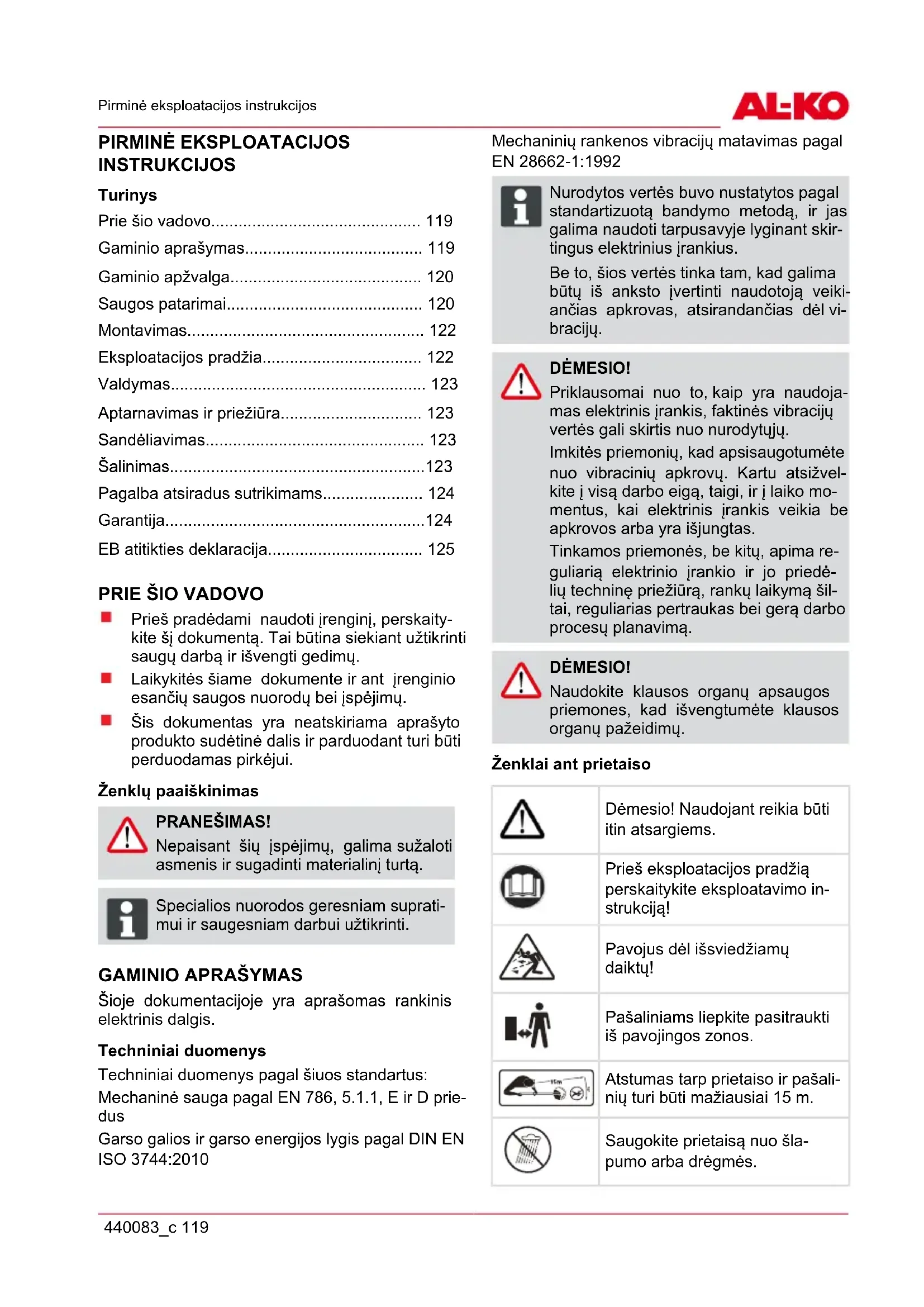 Šioje dokumentacijoje yra aprašomas rankinis elektrinis dalgis. Techniniai duomenys Techniniai duomenys pagal šiuos standartus: Mechaninė sauga pagal EN 786, 5.1.1, E ir D prie- dus Garso galios ir garso energijos lygis pagal DIN EN ISO 3744:2010 Mechaninių rankenos vibracijų matavimas pagal EN 28662-1:1992 ADVICE Nurodytos vertės buvo nustatytos pagal standartizuotą bandymo metodą, ir jas galima naudoti tarpusavyje lyginant skir- tingus elektrinius įrankius. Be to, šios vertės tinka tam, kad galima būtų iš anksto įvertinti naudotoją veiki- ančias apkrovas, atsirandančias dėl vi- bracijų. DĖMESIO! Priklausomai nuo to, kaip yra naudoja- mas elektrinis įrankis, faktinės vibracijų vertės gali skirtis nuo nurodytųjų. Imkitės priemonių, kad apsisaugotumėte nuo vibracinių apkrovų. Kartu atsižvel- kite į visą darbo eigą, taigi, ir į laiko mo- mentus, kai elektrinis įrankis veikia be apkrovos arba yra išjungtas. Tinkamos priemonės, be kitų, apima re- guliarią elektrinio įrankio ir jo priedė- lių techninę priežiūrą, rankų laikymą šil- tai, reguliarias pertraukas bei gerą darbo procesų planavimą. DĖMESIO! Naudokite klausos organų apsaugos priemones, kad išvengtumėte klausos organų pažeidimų. Ženklai ant prietaiso Dėmesio! Naudojant reikia būti itin atsargiems. Prieš eksploatacijos pradžią perskaitykite eksploatavimo in- strukciją! Pavojus dėl išsviedžiamų daiktų! Pašaliniams liepkite pasitraukti iš pavojingos zonos. Atstumas tarp prietaiso ir pašali- nių turi būti mažiausiai 15 m. Saugokite prietaisą nuo šla- pumo arba drėgmės.lt Gaminio aprašymas 120 GTE 350 / 450 / 550 Užsidėti apsauginius akinius, apsauginį šalmą, klausos or- ganų apsaugą. Nedelsdami atjunkite kištuką nuo tinklo, jei il- ginamasis kabelis buvo pažeistas arba trūko! Nedelsdami atjunkite kištuką nuo tinklo, jei ilginamasis kabe- lis buvo pažeistas arba trūko! Reguliuojamas teleskopinis kotas Dalgis turi reguliuojamą teleskopinį kotą. Juo prietaisą galima nustatyti pagal individualius ūgius ir galima pasukti variklio galvutę. Pasukama ir reguliuojama pjovimo galvutė GTE 450 ir 550 turi pasukamą reguliuojamo po- krypio pjovimo galvutę. Paspaudimo automatika Valo galvutėje yra integruota paspaudimo auto- matika (8-4), todėl, veikiant varikliui, galima pail- ginti pjovimo valą. Saugos ir apsauginiai įtaisai Vaikų saugiklis Skylė (5 mm) prie variklio apsauginės relės yra numatyta pakabinamai spynai*. Pakabinama spyna neleidžia neplanuotai paleisti prietaisą.