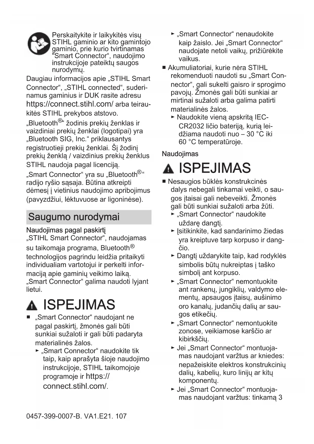 SKAITYKITE IR IŠSAUGOKITE. Perskaitykite ir vadovaukitės toliau nurodyta informacija bei saugos nurodymais. Netinkamai naudojant galima sunkiai susi‐ žaloti. 106 0457-399-0007-B. VA1.E21.Perskaitykite ir laikykitės visų STIHL gaminio ar kito gamintojo gaminio, prie kurio tvirtinamas "Smart Connector“, naudojimo instrukcijoje pateiktų saugos nurodymų. Daugiau informacijos apie „STIHL Smart Connector“, „STIHL connected“, suderi‐ namus gaminius ir DUK rasite adresu https://connect.stihl.com/ arba teirau‐ kitės STIHL prekybos atstovo. „Bluetooth