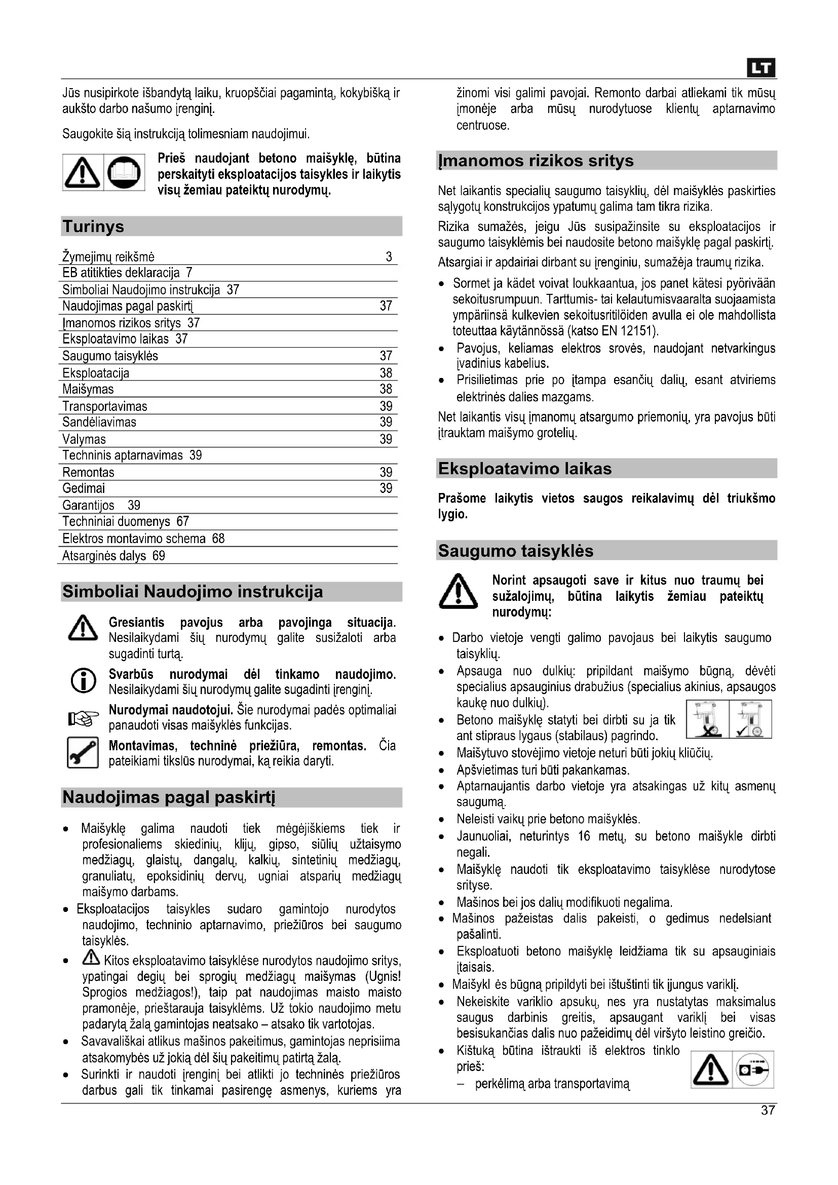 Παρακαλούμε, προσέξτε την συνημμένη δήλωση εγγύησης.37 Jūs nusipirkote išbandytą laiku, kruopščiai pagamintą, kokybišką ir aukšto darbo našumo įrenginį. Saugokite šią instrukciją tolimesniam naudojimui. Prieš naudojant betono maišyklę, būtina perskaityti eksploatacijos taisykles ir laikytis visų žemiau pateiktų nurodymų.