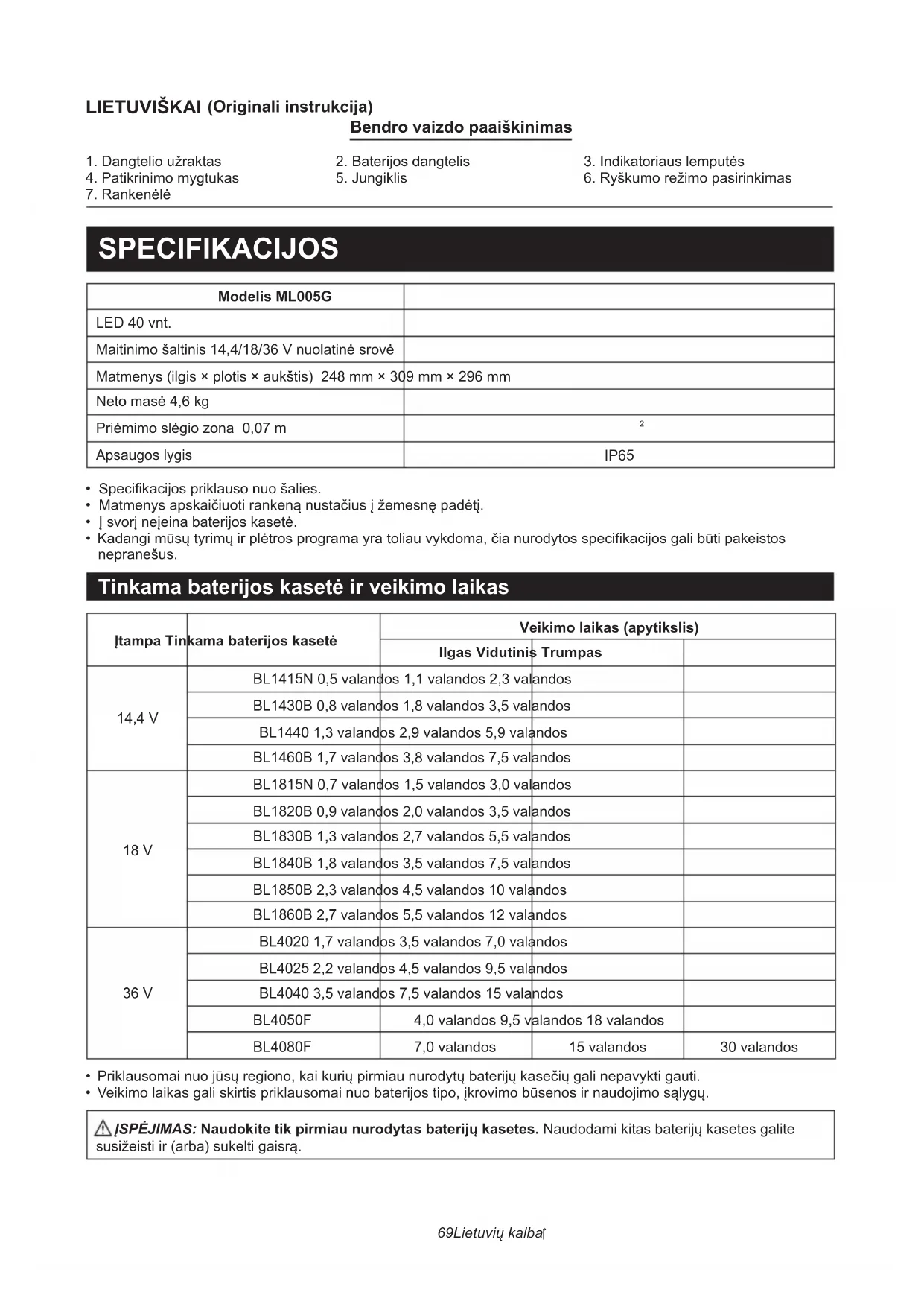 - Kadangi mūsų tyrimų ir plėtros programa yra toliau vykdoma, čia nurodytos specifikacijos gali būti pakeistos nepranešus. Tinkama baterijos kasetė ir veikimo laikas Įtampa Tinkama baterijos kasetė Veikimo laikas (apytikslis) Ilgas Vidutinis Trumpas 14,4 V BL1415N 0,5 valandos 1,1 valandos 2,3 valandos BL1430B 0,8 valandos 1,8 valandos 3,5 valandos BL1440 1,3 valandos 2,9 valandos 5,9 valandos BL1460B 1,7 valandos 3,8 valandos 7,5 valandos 18 V BL1815N 0,7 valandos 1,5 valandos 3,0 valandos BL1820B 0,9 valandos 2,0 valandos 3,5 valandos BL1830B 1,3 valandos 2,7 valandos 5,5 valandos BL1840B 1,8 valandos 3,5 valandos 7,5 valandos BL1850B 2,3 valandos 4,5 valandos 10 valandos BL1860B 2,7 valandos 5,5 valandos 12 valandos 36 V BL4020 1,7 valandos 3,5 valandos 7,0 valandos BL4025 2,2 valandos 4,5 valandos 9,5 valandos BL4040 3,5 valandos 7,5 valandos 15 valandos BL4050F 4,0 valandos 9,5 valandos 18 valandos BL4080F 7,0 valandos 15 valandos 30 valandos