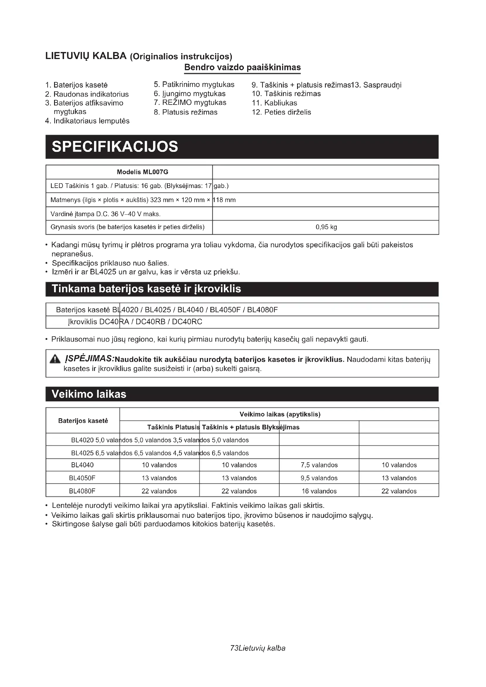- Priklausomai nuo jūsų regiono, kai kurių pirmiau nurodytų baterijų kasečių gali nepavykti gauti. ĮSPĖJIMAS: Naudokite tik aukščiau nurodytą baterijos kasetes ir įkroviklius. Naudodami kitas baterijų kasetes ir įkroviklius galite susižeisti ir (arba) sukelti gaisrą. Veikimo laikas Baterijos kasetėVeikimo laikas (apytikslis)Taškinis Platusis Taškinis + platusis BlyksėjimasBL4020 5,0 valandos 5,0 valandos 3,5 valandos 5,0 valandosBL4025 6,5 valandos 6,5 valandos 4,5 valandos 6,5 valandos BL4040 10 valandos 10 valandos 7,5 valandos 10 valandos BL4050F 13 valandos 13 valandos 9,5 valandos 13 valandos BL4080F 22 valandos 22 valandos 16 valandos 22 valandos