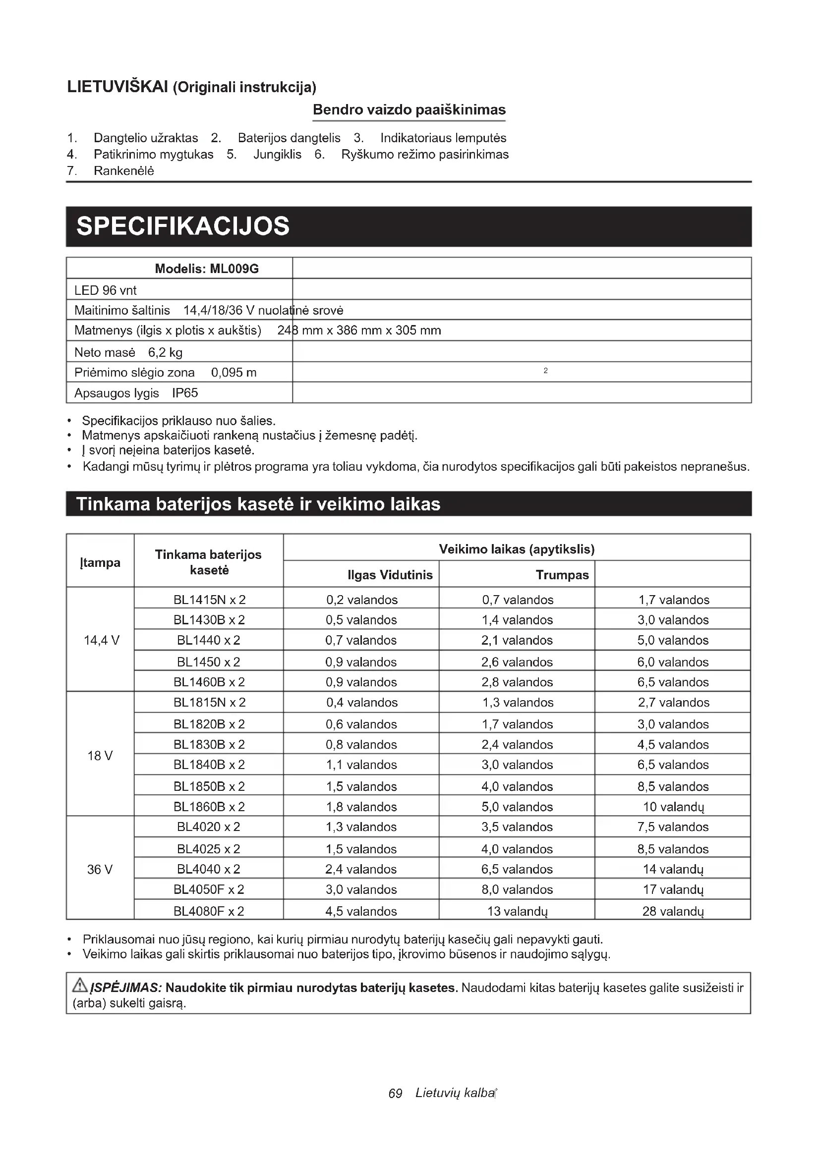 - Kadangimūsųtyrimųirplėtrosprogramayratoliauvykdoma,čianurodytosspecifikacijosgalibūtipakeistosnepranešus. Tinkama baterijos kasetė ir veikimo laikas Įtampa Tinkama baterijos kasetė Veikimo laikas (apytikslis) Ilgas Vidutinis Trumpas 14,4 V BL1415Nx2 0,2valandos 0,7valandos 1,7valandos BL1430Bx2 0,5valandos 1,4valandos 3,0valandos BL1440x2 0,7valandos 2,1valandos 5,0valandos BL1450x2 0,9valandos 2,6valandos 6,0valandos BL1460Bx2 0,9valandos 2,8valandos 6,5valandos 18 V BL1815Nx2 0,4valandos 1,3valandos 2,7valandos BL1820Bx2 0,6valandos 1,7valandos 3,0valandos BL1830Bx2 0,8valandos 2,4valandos 4,5valandos BL1840Bx2 1,1valandos 3,0valandos 6,5valandos BL1850Bx2 1,5valandos 4,0valandos 8,5valandos BL1860Bx2 1,8valandos 5,0valandos 10valandų 36 V BL4020x2 1,3valandos 3,5valandos 7,5valandos BL4025x2 1,5valandos 4,0valandos 8,5valandos BL4040x2 2,4valandos 6,5valandos 14valandų BL4050Fx2 3,0valandos 8,0valandos 17valandų BL4080Fx2 4,5valandos 13valandų 28valandų