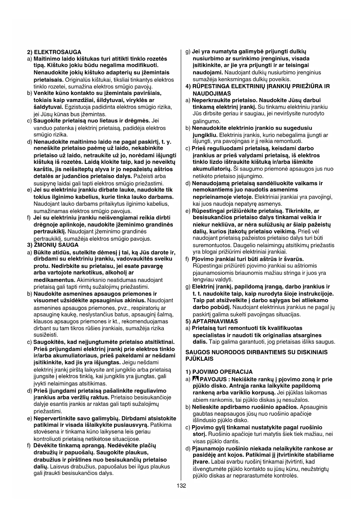 a) Darbovietaturibūtišvariirtvarkinga. Netvarka ar blogai apšviesta darbo vieta gali tapti nelaimingų atsitikimų priežastimi. b) Nedirbkitetokiojeaplinkoje,kuryradegiųskysčių, dujųardulkių. Elektriniai įrankiai gali kibirkščiuoti, o nuo kibirkščių dulkės arba susikaupę garai gali užsidegti. c) Dirbdamisuelektriniuįrankiuneleiskitešaliabūti žiūrovams,vaikamsirlankytojams. Nukreipę dėmesį į kitus asmenis galite nebesuvaldyti prietaiso.132