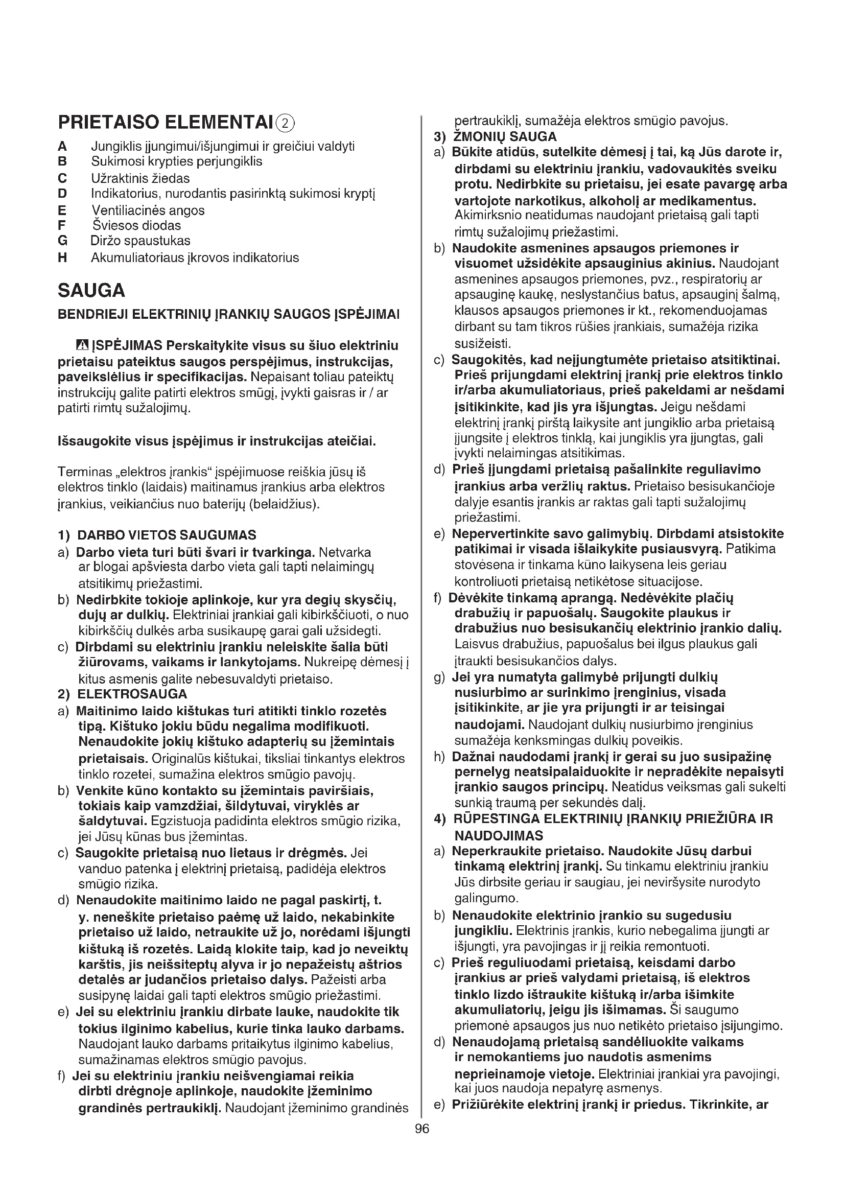 a) Akumuliatoriaus krovimui naudoti tik tuos įkroviklius, kuriuos rekomenduoja gamintojas. Naudojant kitokio tipo akumuliatoriams skirtą įkroviklį, kyla gaisro pavojus. b) Su prietaisu galima naudoti tik jam skirtą akumuliatorių. Naudojant kitokius akumuliatorius atsiranda pavojus susižeisti bei sukelti gaisrą. c) Nelaikykite sąvaržėlių, monetų, raktų, vinių, varžtų ar kitokių metalinių daiktų arti ištraukto iš instrumento akumuliatoriaus kontaktų. Užtrumpinus akumuliatoriaus kontaktus galima nusideginti ar sukelti gaisrą. d) Netinkamai naudojant akumuliatorių, iš jo gali ištekėti skystis. Venkite kontakto su šiuo skysčiu. Jei skystis pateko ant odos, nuplaukite jį vandeniu, jei pateko į akis - nedelsiant kreipkitės į gydytoją. Akumuliatoriaus skystis gali sukelti odos sudirginimą ar nudegimus. e) Nenaudokite pažeisto arba perdaryto akumuliatoriaus arba įrankio. Sugadinti arba perdaryti akumuliatoriai gali veikti nenuspėjamai – sukelti gaisrą, sprogimą arba traumų pavojų. f) Saugokite akumuliatorių arba įrankį nuo ugnies ir aukštos temperatūros. Patekęs į ugnį arba aukštesnę nei 130°C temperatūrą, jis gali sprogti. g) Vykdykite visas įkrovimo instrukcijas ir nekraukite akumuliatoriaus arba įrankio temperatūroje, neatitinkančioje instrukcijose nurodyto temperatūros diapazono ribų. Netinkamai kraunant arba jeigu temperatūra neatitinka nurodyto diapazono ribų, gali sugesti akumuliatorius ir kilti gaisras.