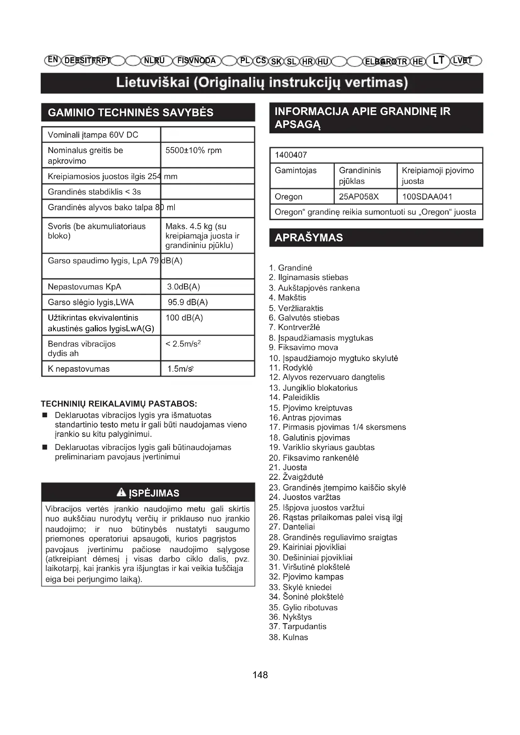 APSAGĄ 1400407Gamintojas GrandininispjūklasKreipiamoji pjovimojuostaOregon 25AP058X 100SDAA041Oregon“ grandinę reikia sumontuoti su „Oregon“ juosta APRAŠYMAS 1. Grandinė2. Ilginamasis stiebas3. Aukštapjovės rankena4. Makštis5. Veržliaraktis6. Galvutės stiebas7. Kontrveržlė8. Įspaudžiamasis mygtukas9. Fiksavimo mova10. Įspaudžiamojo mygtuko skylutė11. Rodyklė12. Alyvos rezervuaro dangtelis13. Jungiklio blokatorius14. Paleidiklis15. Pjovimo kreiptuvas16. Antras pjovimas17. Pirmasis pjovimas 1/4 skersmens18. Galutinis pjovimas19. Variklio skyriaus gaubtas20. Fiksavimo rankenėlė21. Juosta22. Žvaigždutė23. Grandinės įtempimo kaiščio skylė24. Juostos varžtas25. Išpjova juostos varžtui26. Rąstas prilaikomas palei visą ilgį27. Danteliai28. Grandinės reguliavimo sraigtas29. Kairiniai pjovikliai30. Dešininiai pjovikliai31. Viršutinė plokštelė32. Pjovimo kampas33. Skylė kniedei34. Šoninė plokštelė35. Gylio ribotuvas36. Nykštys37. Tarpudantis38. Kulnas 148HE