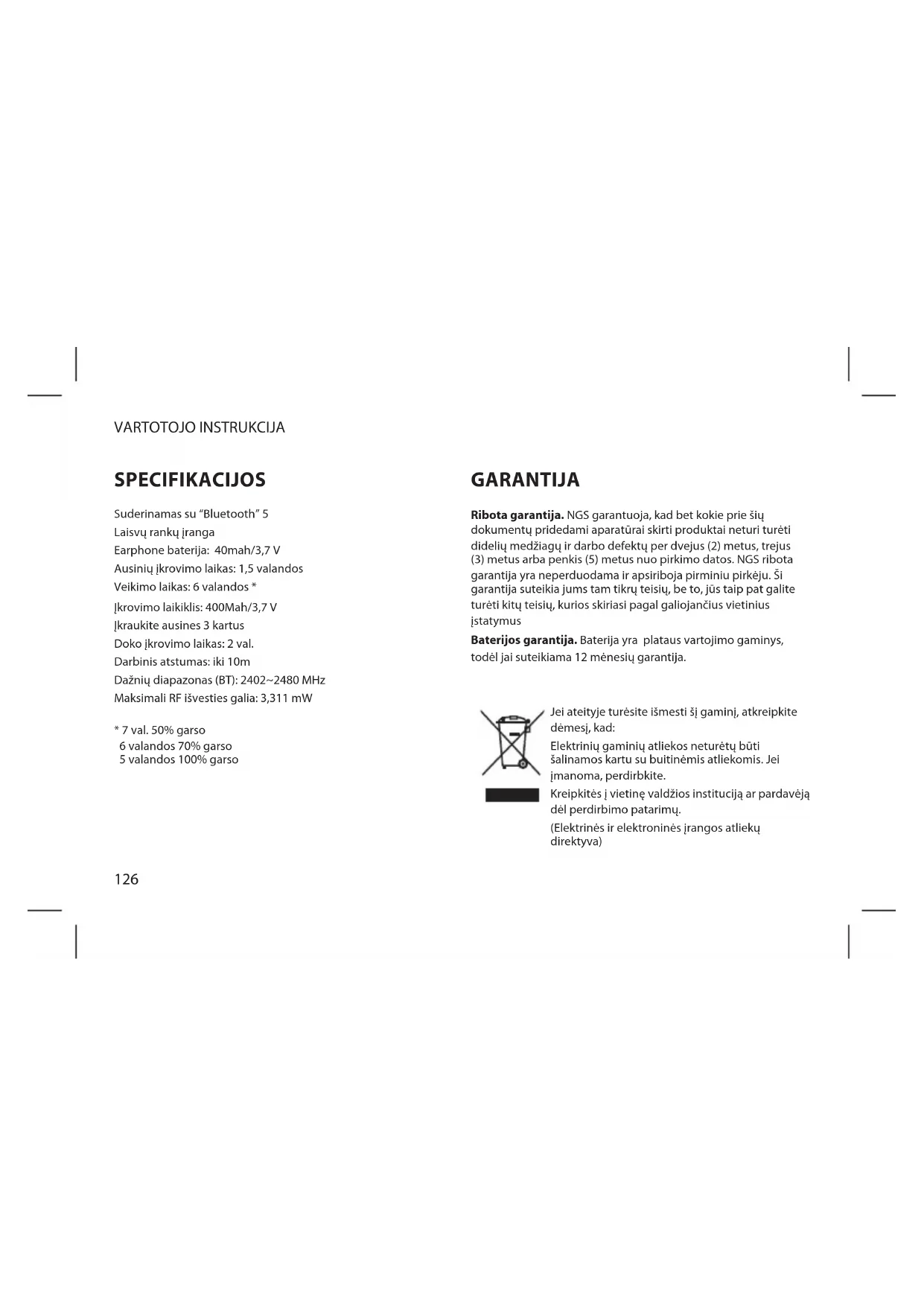 SPECIFIKACIJOS Jei ateityje turėsite išmesti šį gaminį, atkreipkite dėmesį, kad: Elektrinių gaminių atliekos neturėtų būti šalinamos kartu su buitinėmis atliekomis. Jei įmanoma, perdirbkite. Kreipkitės į vietinę valdžios instituciją ar pardavėją dėl perdirbimo patarimų. (Elektrinės ir elektroninės įrangos atliekų direktyva) GARANTIJA Ribota garantija. NGS garantuoja, kad bet kokie prie šių dokumentų pridedami aparatūrai skirti produktai neturi turėti didelių medžiagų ir darbo defektų per dvejus (2) metus, trejus (3) metus arba penkis (5) metus nuo pirkimo datos. NGS ribota garantija yra neperduodama ir apsiriboja pirminiu pirkėju. Ši garantija suteikia jums tam tikrų teisių, be to, jūs taip pat galite turėti kitų teisių, kurios skiriasi pagal galiojančius vietinius įstatymus Baterijos garantija. Baterija yra plataus vartojimo gaminys, todėl jai suteikiama 12 mėnesių garantija. Suderinamas su “Bluetooth” 5 Laisvų rankų įranga Earphone baterija: 40mah/3,7 V Ausinių įkrovimo laikas: 1,5 valandos Veikimo laikas: 6 valandos * Įkrovimo laikiklis: 400Mah/3,7 V Įkraukite ausines 3 kartus Doko įkrovimo laikas: 2 val. Darbinis atstumas: iki 10m Dažnių diapazonas (BT): 2402~2480 MHz Maksimali RF išvesties galia: 3,311 mW