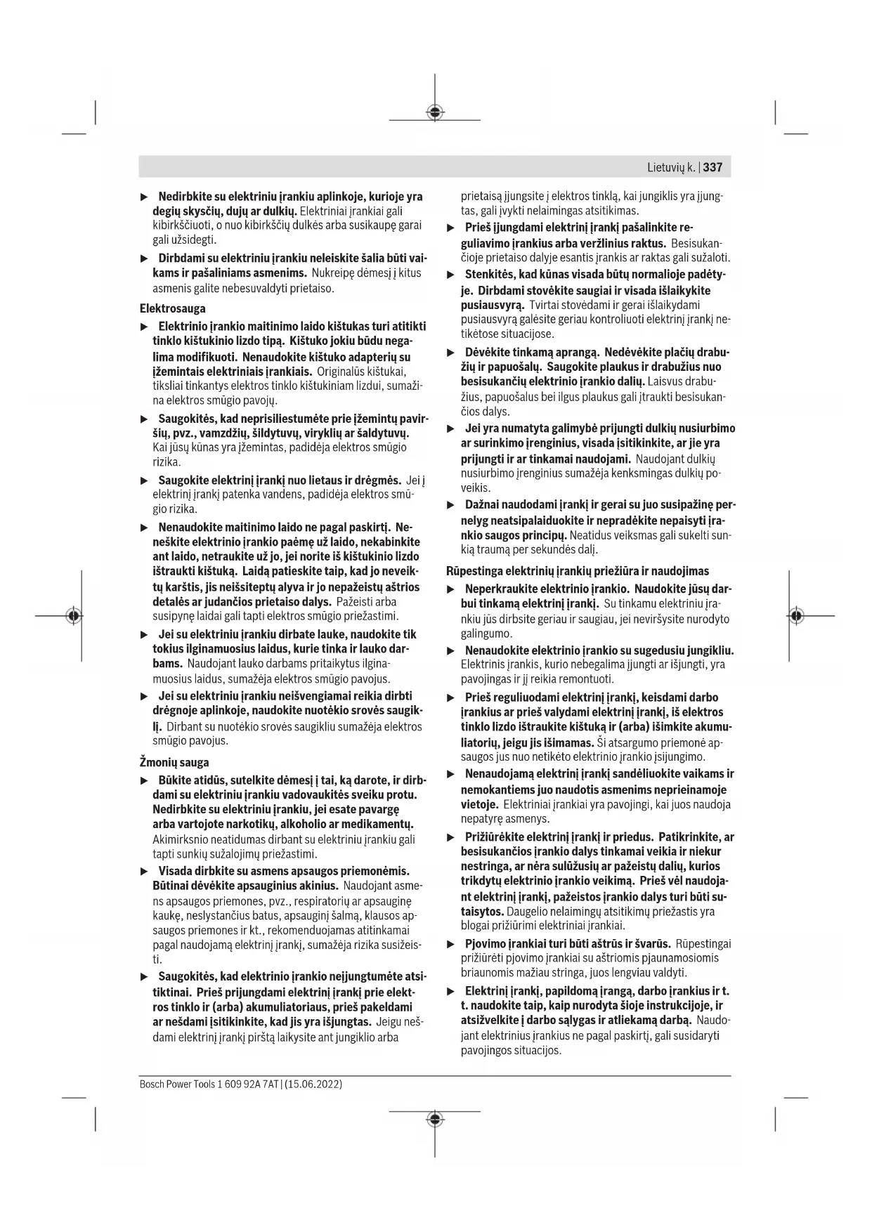Šlifuojant plonas skardas arba kitokias labai vibruojančias medžiagas su dideliu paviršiumi, triukšmo emisijos vertė gali padidėti 15dB. Tinkamais sunkiais izoliaciniais kilimėliais padidėjusią garso emisiją galima sumažinti. Atsižvelgti į didesnę triukšmo emisiją reikia tiek ver- tinant triukšmo galios riziką, tiek parenkant tinkamas klausos apsau- gos priemones. Šioje instrukcijoje pateiktas vibracijos lygis ir triukšmo emisi- ja buvo išmatuoti pagal standartizuotą matavimo metodą, ir juos galima naudoti elektriniams įrankiams palyginti. Jie taip pat skirti vibracijos ir triukšmo emisijai iš anksto įvertinti. Nurodytas vibracijos lygis ir triukšmo emisijos vertė atspindi pagrindinius elektrinio įrankio naudojimo atvejus. Tačiau jei- gu elektrinis įrankis naudojamas kitokiai paskirčiai, su kito- kiais darbo įrankiais arba jeigu jis nepakankamai techniškai prižiūrimas, vibracijos lygis ir triukšmo emisijos vertė gali ki- sti. Tokiu atveju vibracijos ir triukšmo emisija per visą darbo laikotarpį gali žymiai padidėti. Norint tiksliai įvertinti vibracijos ir triukšmo emisiją per tam tikrą darbo laiką, reikia atsižvelgti ir į laiką, per kurį elektrinis įrankis buvo išjungtas arba, nors ir veikė, bet nebuvo naudo- jamas. Tai įvertinus, vibracijos ir triukšmo emisija per visą darbo laiką žymiai sumažės. Dirbančiajam nuo vibracijos poveikio apsaugoti paskirkite papildomas apsaugos priemones, pvz.: elektrinių ir darbo įrankių techninę priežiūrą, rankų šildymą, darbo eigos orga- nizavimą. Apsauga nuo atatrankos užstrigus įrankiui Įvykus staigiai elektrinio įrankio atatrankai, pvz., užstrigus pjovimo diskui, elektroninis įtai- sas nutraukia srovės tiekimą į variklį. Norėdami įrankįpakartotinai įjungti, įjungi- mo-išjungimo jungiklį(8) nustatykite į išjungimo padėtį ir elektrinį įrankį vėl įjunkite. Inercinis stabdys Elektrinis įrankis yra su elektronine Bosch „Bra- ke“ sistema. Išjungus, šlifavimo įrankis sustab- domas per kelias sekundes. Palyginti su kampi- nio šlifavimo mašinomis be inercinio stabdžio, judėjimo iš inercijos laikas yra žymiai trumpes- nis, ir galima anksčiau padėti elektrinį įrankį. Švelnus paleidimas Elektroninis švelnaus paleidimo įtaisas riboja sukimo mome- ntą įjungimo metu ir užtikrina elektrinio įrankio paleidimą be trūkčiojimų. Nurodymas: jei elektrinis įrankis įjungtas iš karto pradeda veikti didžiausiu sūkių skaičiumi, vadinasi yra sugedęs švel- naus paleidimo įtaisas ir apsauga nuo pakartotinio įsijungi- mo. Elektrinį įrankį reikia nedelsiant išsiųsti į klientų aptarna- vimo skyrių; adresai nurodyti skyriuje „Klientų aptarnavimo tarnyba ir konsultavimo skyrius“. Apsauga nuo pakartotinio įsijungimo Jei dirbant nutraukiamas srovės tiekimas, apsauga nuo pa- kartotinio įjungimo neleidžia elektriniam įrankiui nekontro- liuotai įsijungti. Norėdami įrankį pakartotinai įjungti, įjungimo-išjungimo jungiklį (8) nustatykite į išjungimo padėtį ir elektrinį įrankį vėl įjunkite. Išjungimo įtaisas, suveikiantis sutrenkus įrankį Integruotas išjungimo įtaisas, suveikiantis sutrenkus įrankį, iškart išjungia elektrinį įrankį, jei jis nukrenta ant žemės. No- rėdami įrankįpakartotinai įjungti, įjungimo-išjungimo jungiklį(8) nustatykite į išjungimo padėtį ir elektrinį įrankį vėl įjunkite. Akumuliatorius Bosch akumuliatorinius elektrinius įrankius parduoda ir be akumuliatoriaus. Ar į jūsų elektrinio įrankio tiekiamą komp- lektą įeina akumuliatorius, galite pažiūrėti ant pakuotės. Akumuliatoriaus įkrovimas u Naudokite tik techninių duomenų skyriuje nurodytus kroviklius. Tik šie krovikliai yra priderinti prie Jūsų elekt- riniame prietaise naudojamo ličio jonų akumuliatoriaus. 1 609 92A 7AT | (15.06.2022) Bosch Power ToolsLietuvių k. | 343 Nuoroda: laikantis tarptautinių transportavimo teisės aktų, ličio jonų akumuliatoriai tiekiami dalinai įkrauti. Kad akumu- liatorius veiktų visa galia, prieš pirmąjį naudojimą akumulia- torių visiškai įkraukite. Akumuliatoriaus įdėjimas Įkrautą akumuliatorių stumkite į akumuliatoriaus laikiklį, kol pajusite, kad užsifiksavo. Akumuliatoriaus išėmimas Norėdami išimti akumuliatorių, paspauskite akumuliatoriaus atblokavimo klavišus ir išimkite akumuliatorių. Traukdami nenaudokite jėgos. Akumuliatoriuje yra 2fiksavimo pakopos, kurios saugo, kad netikėtai paspaudus akumuliatoriaus atblokavimo klavišą, akumuliatorius neiškristų. Į elektrinį prietaisą įstatytą akumu- liatorių tinkamoje padėtyje palaiko spyruoklė. Akumuliatoriaus įkrovos būklės indikatorius Žali akumuliatoriaus įkrovos būklės indikatoriairodo akumu- liatoriausįkrovos būklę. Dėl saugumo, įkrovos būklę galima pažiūrėti tik tada, kai elektrinis įrankis neveikia. Jei norite, kad būtų parodyta įkrovos būklė, paspauskite įkrovos būklės mygtuką arba . Tai galima ir tada, kai akumuliatorius yra išimtas. Jei paspaudus mygtuką nešviečia nei vienas šviesadiodis in- dikatorius, vadinasi akumuliatorius yra pažeistas ir jį reikia pakeisti. Akumuliatoriaus tipas GBA 18V... Šviesos diodas Talpa Šviečia nuolat 3xžali 60–100% Šviečia nuolat 2xžali 30–60% Šviečia nuolat 1xžalias 5–30% Mirksi 1xžalias 0–5% Akumuliatoriaus tipas ProCORE18V... Šviesos diodas Talpa Šviečia nuolat 5xžali 80–100% Šviečia nuolat 4xžali 60–80% Šviečia nuolat 3xžali 40–60% Šviečia nuolat 2xžali 20–40% Šviečia nuolat 1xžalias 5–20% Mirksi 1xžalias 0–5% Nuorodos, kaip optimaliai elgtis su akumuliatoriumi Saugokite akumuliatorių nuo drėgmės ir vandens. Akumuliatorių sandėliuokite tik nuo −20°C iki 50°C tem- peratūroje. Pvz., nepalikite akumuliatoriaus vasarą automo- bilyje. Akumuliatoriaus ventiliacines angas valykite minkštu, švariu ir sausu teptuku. Pastebimas įkrauto akumuliatoriaus