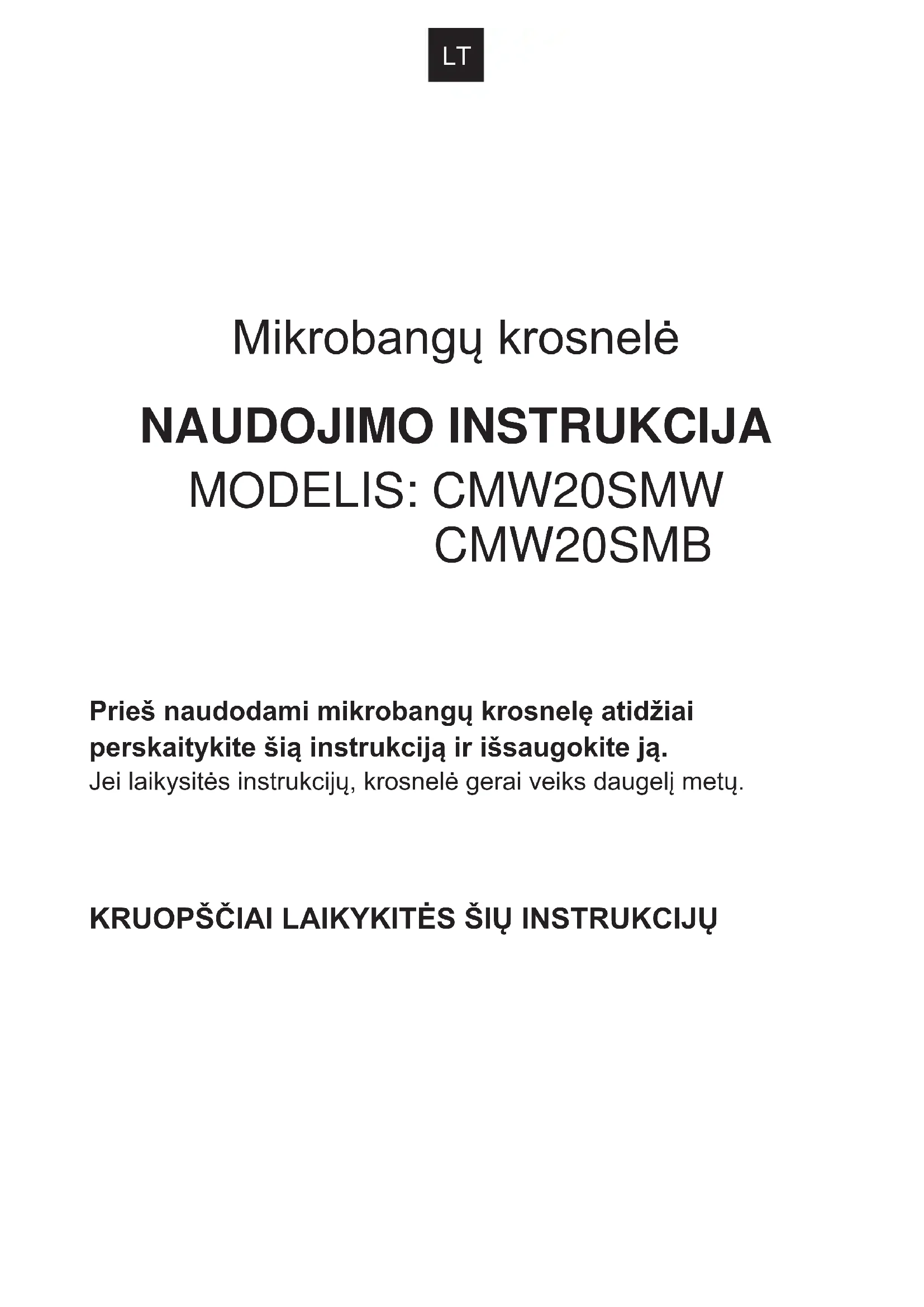 CMW20SMB Prieš naudodami mikrobangų krosnelę atidžiai perskaitykite šią instrukciją ir išsaugokite ją. Jei laikysitės instrukcijų, krosnelė gerai veiks daugelį metų. KRUOPŠČIAI LAIKYKITĖS ŠIŲ INSTRUKCIJŲLT