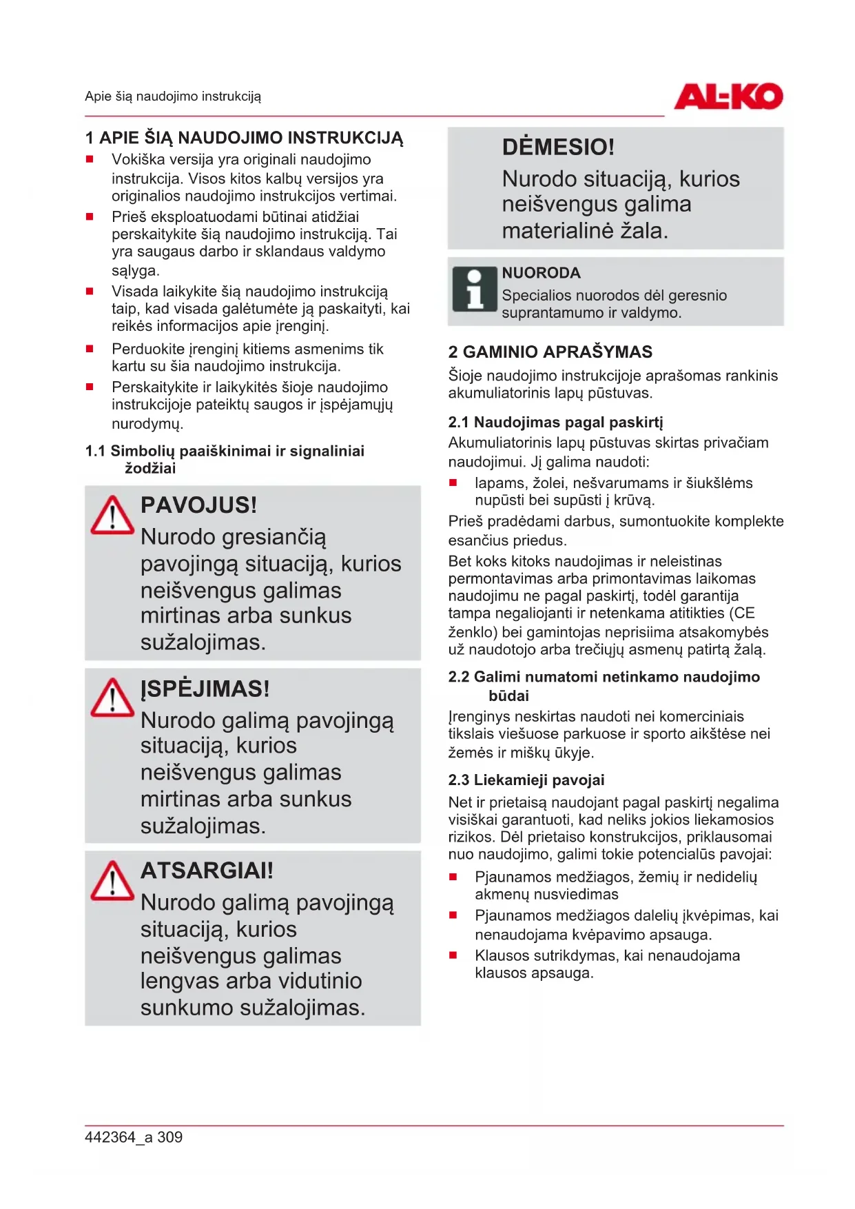 žodžiai PAVOJUS! Nurodo gresiančią pavojingą situaciją, kurios neišvengus galimas mirtinas arba sunkus sužalojimas. ĮSPĖJIMAS! Nurodo galimą pavojingą situaciją, kurios neišvengus galimas mirtinas arba sunkus sužalojimas. ATSARGIAI! Nurodo galimą pavojingą situaciją, kurios neišvengus galimas lengvas arba vidutinio sunkumo sužalojimas. DĖMESIO! Nurodo situaciją, kurios neišvengus galima materialinė žala. NUORODA Specialios nuorodos dėl geresnio suprantamumo ir valdymo.
