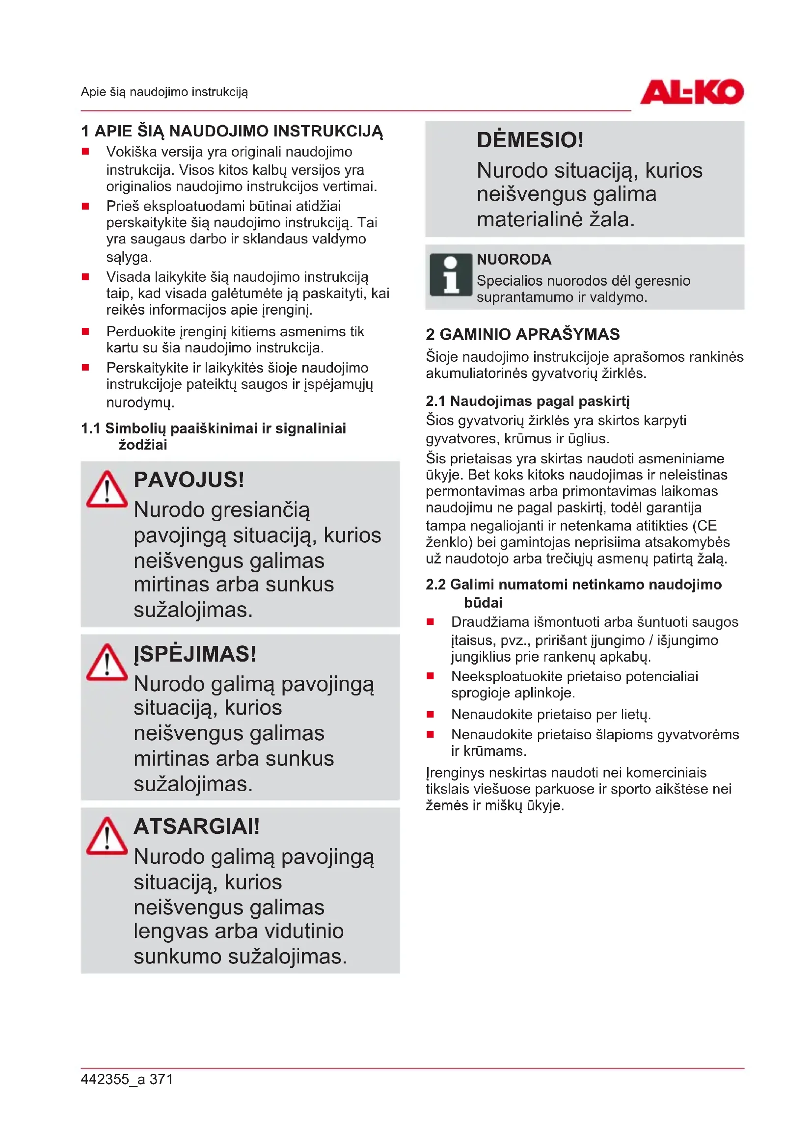 Iškilus klausimų dėl garantijos, remonto ir atsarginių dalių, kreipkitės į savo artimiausią techninės priežiūros punktą. Jį rasite internete tokiu adresu: www.al-ko.com/service-contacts442355_a 389 Pagalba atsiradus sutrikimų