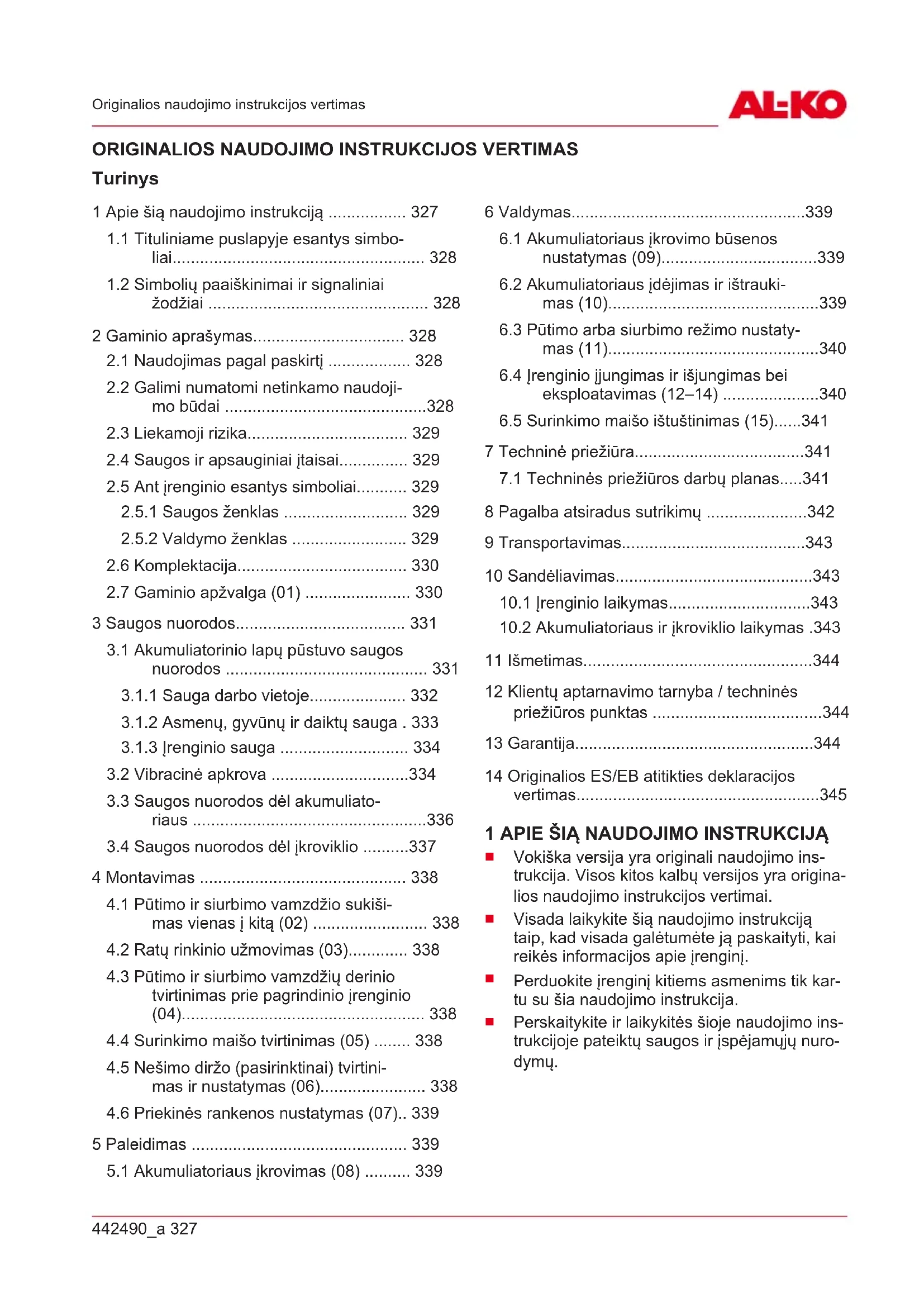 Iškilus klausimų dėl garantijos, remonto ir atsargi- nių dalių, kreipkitės į savo artimiausią AL-KO techninės priežiūros skyrių. Jį rasite internete to- kiu adresu: www.al-ko.com/service-contacts 13 GARANTIJA Galimus įrenginio medžiagų ar gamybos defektus įstatymų numatytu pretenzijų dėl trūkumų reiškimo sena- ties termino laikotarpiu mes šaliname savo nuožiūra remonto arba keitimo būdu. Senaties terminas nusta- tomas kiekvienu konkrečiu atveju pagal šalies, kurioje įrenginys buvo įsigytas, teisės aktus.442490_a 345 Originalios ES/EB atitikties deklaracijos vertimas Mūsų garantinis įsipareigojimas galioja tik šiais atvejais: